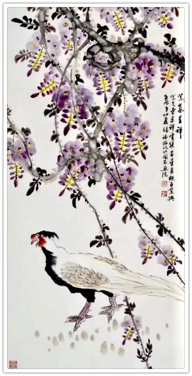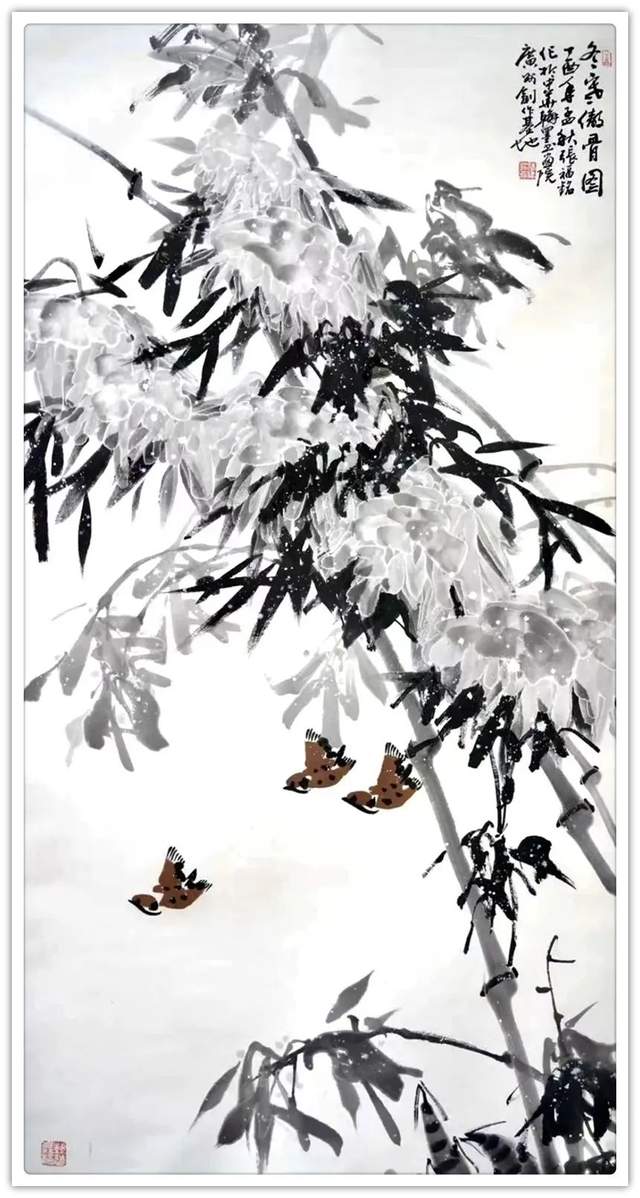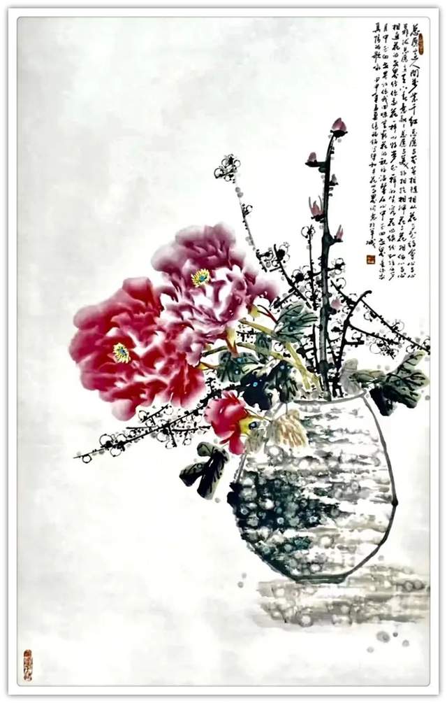 同样,他画其他花鸟作品也是文武兼备的证见!笔墨铿锵写意富贵牡丹,非仅富贵也!最有雄迈品!铁笔塑铁筋,雄墨写雄魂,骨法用笔,应物象形!再经过随类赋彩,就把牡丹画得既有君子之修,也有侠者之勇!他的画法刚则万分刚猛,雄则百倍雄强,给观赏者塑造起一个可以感受震撼力的艺术空间。在这个空间里游目骋怀,必然会心感铮铮!浓墨重彩,浑厚华滋,无限的审美张力,令他成为画坛的铁流派。唯有在军中得到身心熔锻,方得笔墨如此峥嵘!