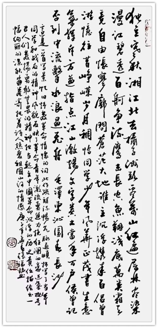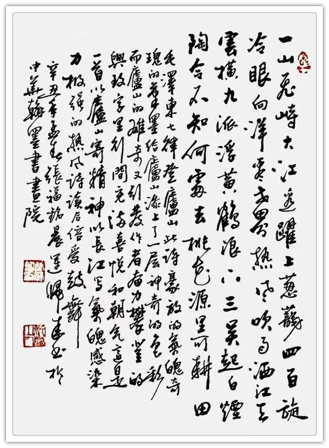 他画画有军队生活给予的气势磅礴,也有文人修养带来的儒雅清芬,写意梅兰竹菊,也可以盈满诗情画意。一作一品,耐于读,神于观,看得人赏心悦目,醉享无限。又有博涉多优,奋笔作书法的精气神。诸书皆成,尤其一笔行草写得瘦硬有精神。磨砺书法,观尽前人笔墨奇迹,见地深刻,可以在起笔落笔之际,把行草作品写得遂心应手,天质自然!