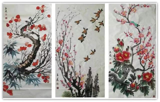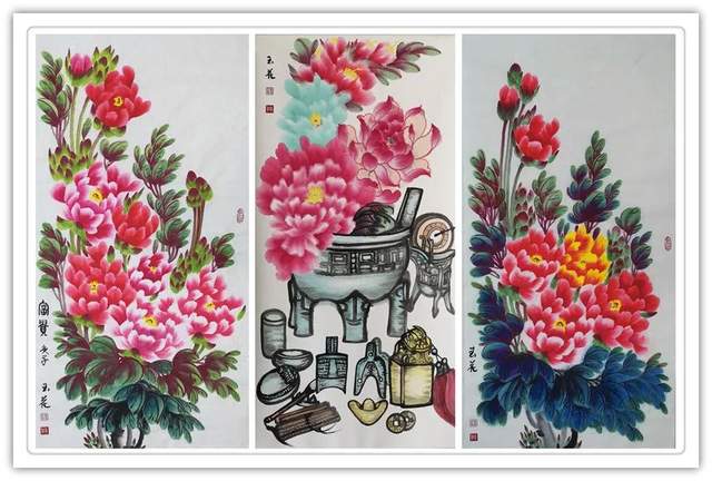 作品风格:工笔、写意、山水、泼墨泼彩山水、花鸟、人物古代仕女、书法创作;年画系列、油画系列、自画像古装系列、山水花鸟画系列、牡丹画系列、诗书画系列、扇面画系列、中国绣品画系列、中国瓷器画系列、书画长卷系列、丈二以上代表作系列。