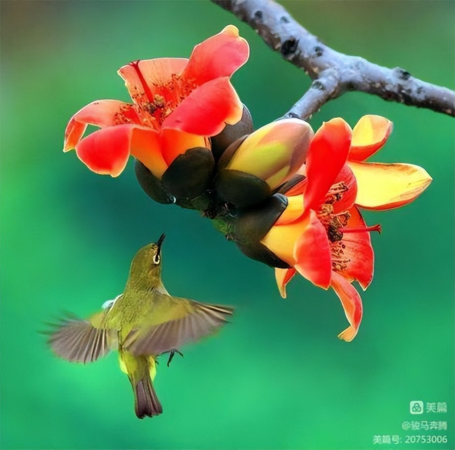 翠鸟翻飞迎旭日,红花烂漫缀青山。