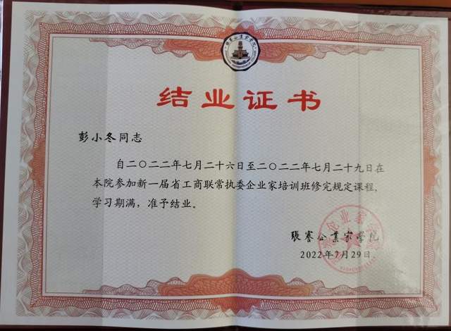 中国经济风向标南京8月1日讯(李健)弘扬张謇企业家精神,持续提升履职能力,7月26日-29日,新一届江苏省工商联常执委企业家培训班在张謇企业家学院成功举办,江苏省辽宁商会会长彭小冬参加培训并顺利结业。