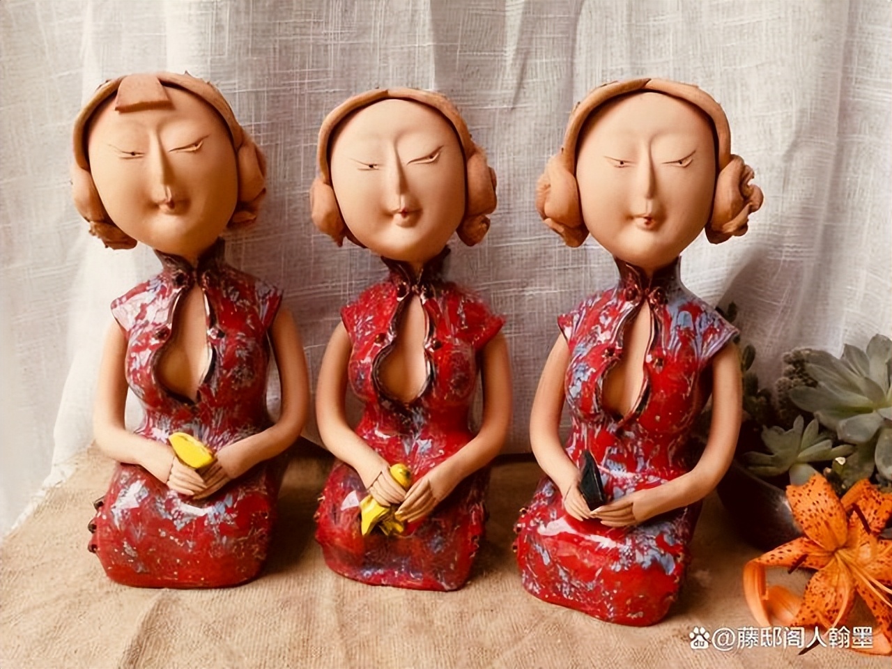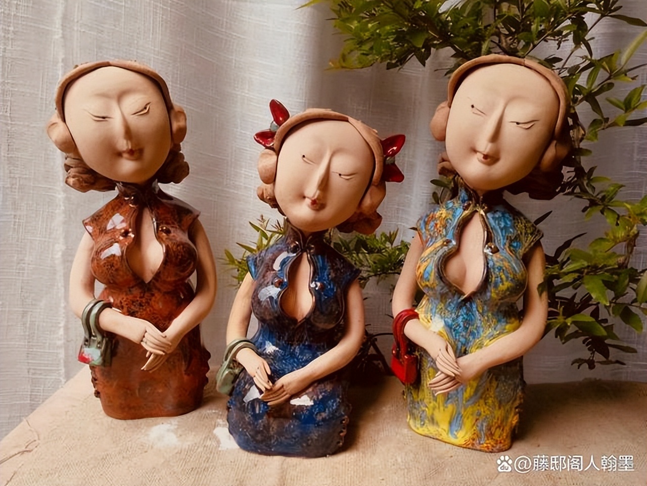 注释:*李文锟,字琅嬛,亭云轩主人。毕业于山东艺术学院。拜著名陶艺家房晓军门下。其油画色彩绚烂、中国画笔墨纯美。现致力于陶艺研究,其陶艺人物雍容华贵,色彩绚丽,情笃唐韵,意绽形外。可谓是“榴裙九彩耕,佳丽白云生。炉火淬千度,陈泥凝万情。”(老藤·五绝·观琅嬛陶艺人物)