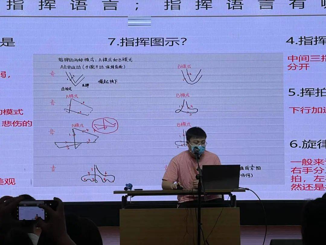 孟诗尧老师从什么是指挥语言?指挥语言的内容、指挥语言的“噤声”、指挥的模式、挥拍时的加速减速、旋律的描绘等几个方面给老师们进行了详细的讲解。孟老师结合混声合唱《黄水谣》为大家进行了详细的曲目解读,同时也为老师们讲解了新的读谱方法。他用图形与图示结合的方法为该作品的每小节设计出了特有的指挥图示,并带领教师们现场进行反复练习。