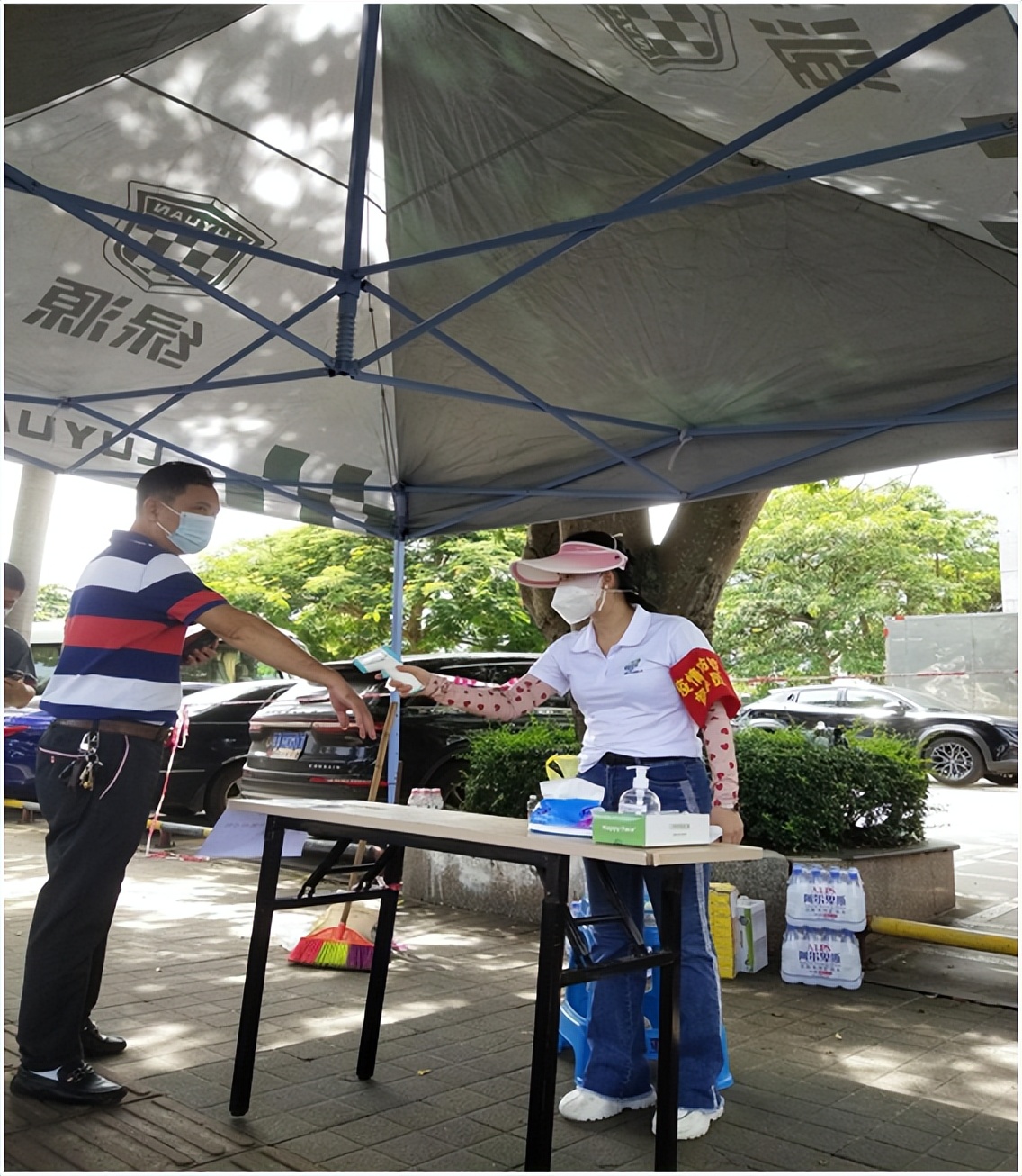 在一天中最热的时间段,海口朗廷的同事们准备好冰凉的水果和饮料,赶到海口市龙华区万象城核酸检测点看望医务人员和志愿者。
