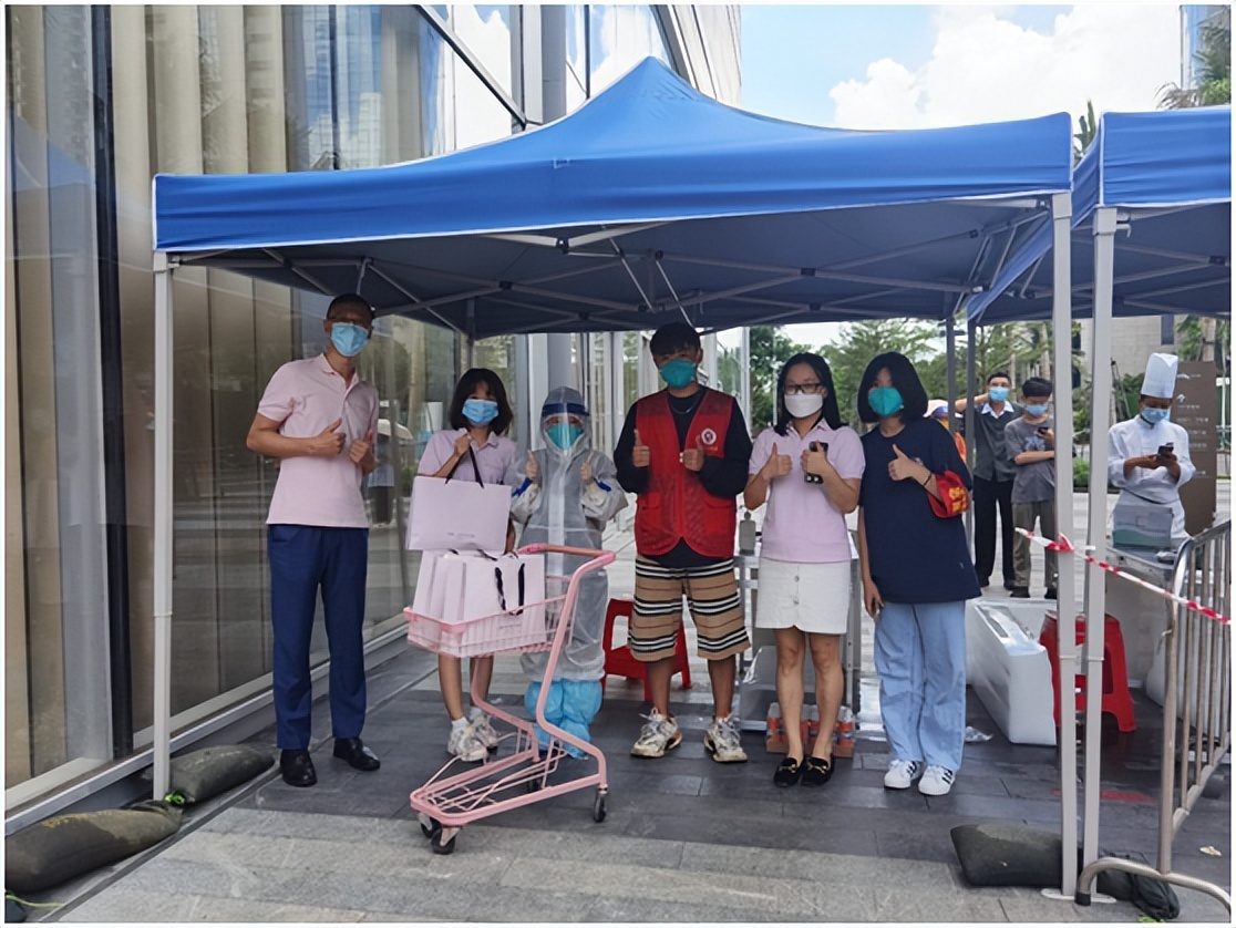 海口五指山国际酒店自8月9日起每天都打包几百份以上餐食餐包提供给防疫一线人员,8月12日一天就打包了4200份(8月12日);酒店杨振志等部分党员还积极参加了海府街道志愿者服务队,奔赴明珠广场、海建广场、亿圣和广场等核酸检测点为前来做核酸检测的市民服务。