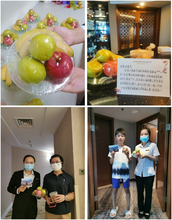 8月10日下午4点左右,酒店迎来了防疫工作组。住店期间,店总时刻关注防疫医务人员的衣食住行,酒店为他们准备下午茶、水果,餐厅精心准备一日三餐,客房温馨留言条。确保他们住