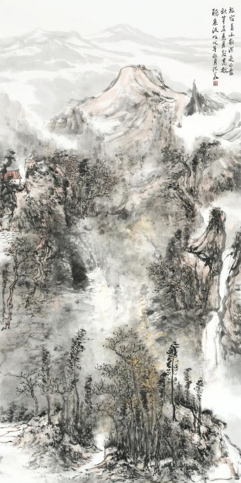 所以,在我的书画里,毫无疑问地融入了北派李可染和南派陆俨少的艺术血脉。李可染先生认为,对于中国画的传统,要用最大的功力打进去,用最大的勇气打出来。陆俨少先生说的学画十分法:“四分读书,三分写字,三分画画。”这两位山水画大家对后学们的教诲,也成了我的座右铭。(附图为盛洪义画作)