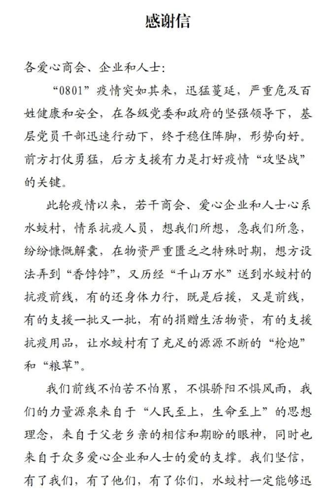 为了将这批物资送往水蛟村,海南省“安徽两会”的领导们也费了九牛二虎之力。周功民会长求助省公安厅、省红十字会,吴皖民书记咨询温州、潮汕商会物流公司,均因车辆或被征用或无通行证等原因而无果。最终是林月兵秘书长联系上省邮政公司市场开发部总经理葛向东。翌日,在向东总经理的大力支持下,海南省安徽商会终将第一批防控物品和生活物资,通过邮政专车发往水蛟村抗疫一线。这批物资抵达该村防控点后,该村两委给海南省“安徽两会”写了感谢信,称这批援助物资犹如旱日甘霖,又似雪中送炭。