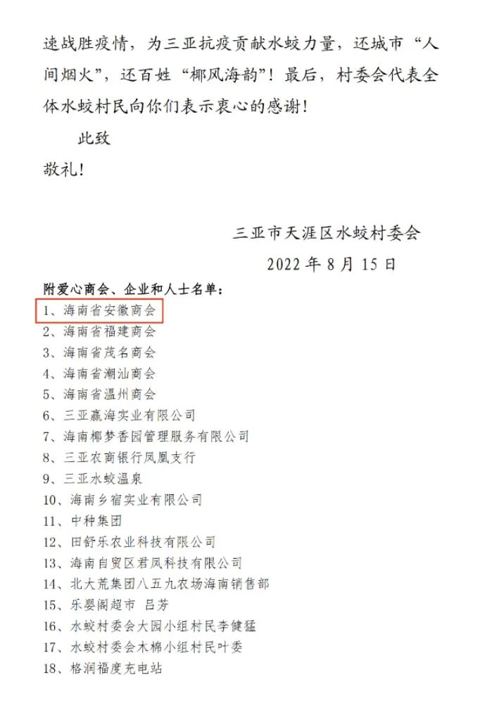海南省安徽商会会长单位、华闻集团所属三亚凤凰岭景区积极响应地方政府号召,自8月4日起主动暂停营业,并积极做好已售门票的延期和退票工作。同时,三亚凤凰岭景区员工就地转为志愿者,积极投身抗疫工作;凤凰岭景区还向吉阳、海棠等社区捐赠了自主品牌的“凤凰甘露”矿泉水。8月9日,三亚凤凰岭景区召开志愿者表彰大会,为该公司每一位志愿者颁发志愿者荣誉证书。同日,三亚深蓝医学工程有限公司向青年志愿者服务队捐赠爱心物资。