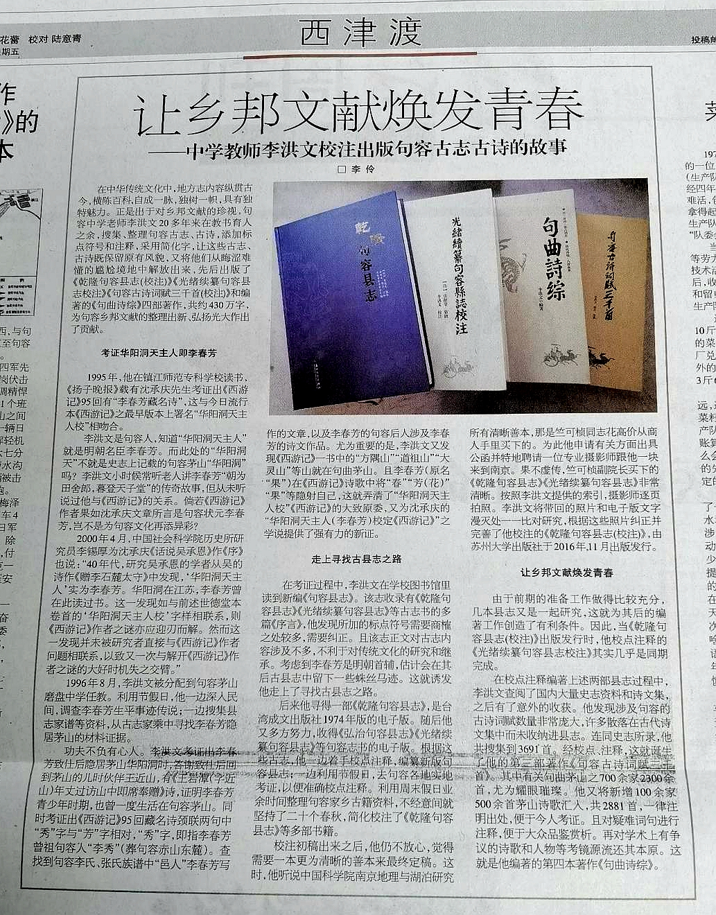 祝诚教授《京江晚报》(2020.7.16)介绍作者四书之“喜读李洪文有关句容文史的四部新著”书评。