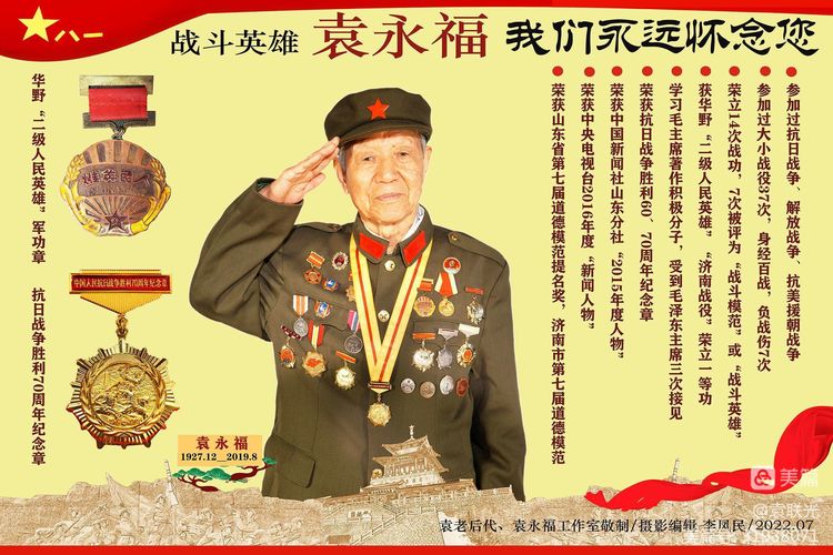 袁永福(1929-2019),山东魚台人。1945年7月参加八路军,1946年10月火线加入中国共产党。1976 年转业,1988 年离休。军旅生涯 31 年,历经抗日战争、解放战争、抗美援朝战争和社会主义建设时期。先后在八路军鲁中军区4师10团、中国人民解放军华东野战军第8纵队22师64团、中国人民解放军第26军76师226团、中国人民志愿军第26军76师226团、中国人民解放军第1军1师坦克团、中国人民解放军第1军1师坦克团和中国人民解放军坦克第11师等部队战斗和工作。历任通信员、班长、军事教员、副指导员、车务主任、干事、指导员、连长、副营长、技术处长、师管理科长等职,其中在参加武汉军区支援国家“五七”油田(后为江汉油田)期间,任建委4团政委,先后参加过37次大小战役,数百次大小战斗。因战7次光荣负伤,被评为三等甲级革命伤残军人。袁永福在历次战斗中英勇善战,不怕牺牲,出色完成任务,先后荣立14次战功,其中一等功5次,二等功5次,三等功4次;一次荣获华东野战军“二级人民英雄”称号:一次评为鲁中军区“二级战斗英模”6次当选战斗模范;在济南战役中荣立一等功,荣获“战斗模范”荣誉称号。被华东野战军评为“遵纪守法爱民模范”和“尊干爱兵模范”,两次被评为“模范共产党员”。曾三次受到毛泽东主席等党和国家领导人接见,光荣出席首都1968年国庆观礼。荣获朝鲜人民英雄军功章,济南战役胜利60周年和抗日战争胜利60、70周年纪念章。和平建设时期,多次被评为武汉军区和军区装甲兵先进典型。1976年退役,转业至济南内燃机厂任副厂长。1988年12月离休,享受厅级干部待遇。袁永福离休后,不忘初心,以讲战斗故事、找战友、写回忆录、寻访故地等途经,大力宣扬爱国主义和革命英雄主义精神,唱响主旋律,传播正能量,其事迹被各大新闻媒体报道百余次,成为人民群众崇敬的战斗英雄和新闻人物。曾被中国新闻社山东分社评为“2015 山东年度人物”。中央电视台《我们的 2016》“你的名字一一我的责任”专题节目中,生动展示了老战斗英雄的新风采。袁永福荣获 2016年中央电视台“年度人物”荣登2018年“山东好人榜”“济南好人榜”。2019年荣获第七届山东省道德模范提名奖,被评为第七届济南市道德模范。