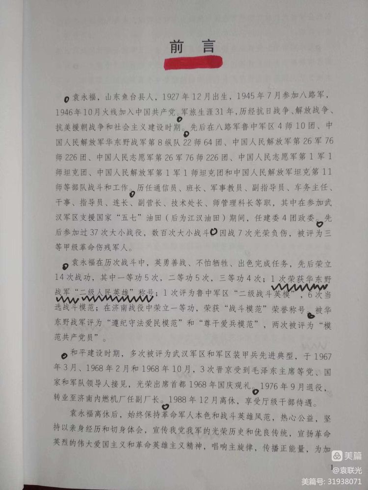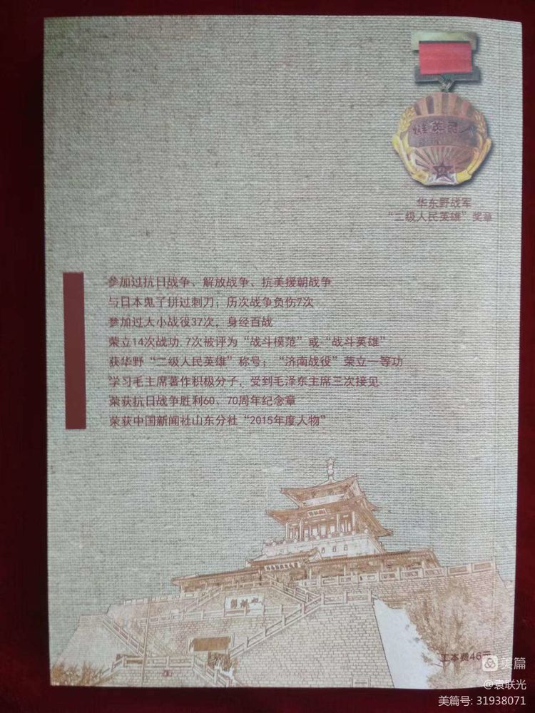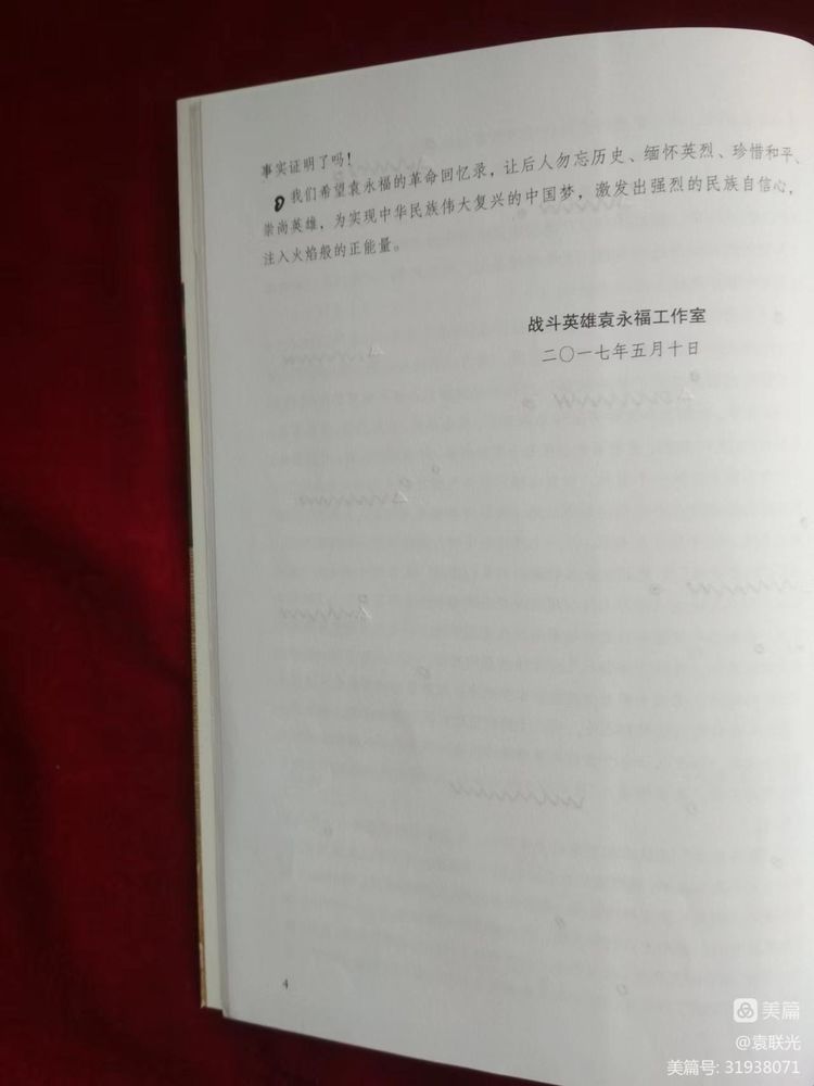 袁永福等著。李庆峰、李凤民主编,袁联光副主编。该书为袁联光同志题赠本。2016 年5月2日,受英雄事迹感染和激励,在“山东好人”、爱心人士房泽安的倡导下,李庆峰、李凤民、沈鲁、刘昌宁、林均凤等7位同志成立“战斗英雄袁永福工作室”,自觉自愿为老英雄撰写回忆录出一份力量,决心为老英雄实现心愿尽一份光荣的义务,这个工作室的集体努力劳动给我们留下了袁永福老英雄的辉煌的人生记录。