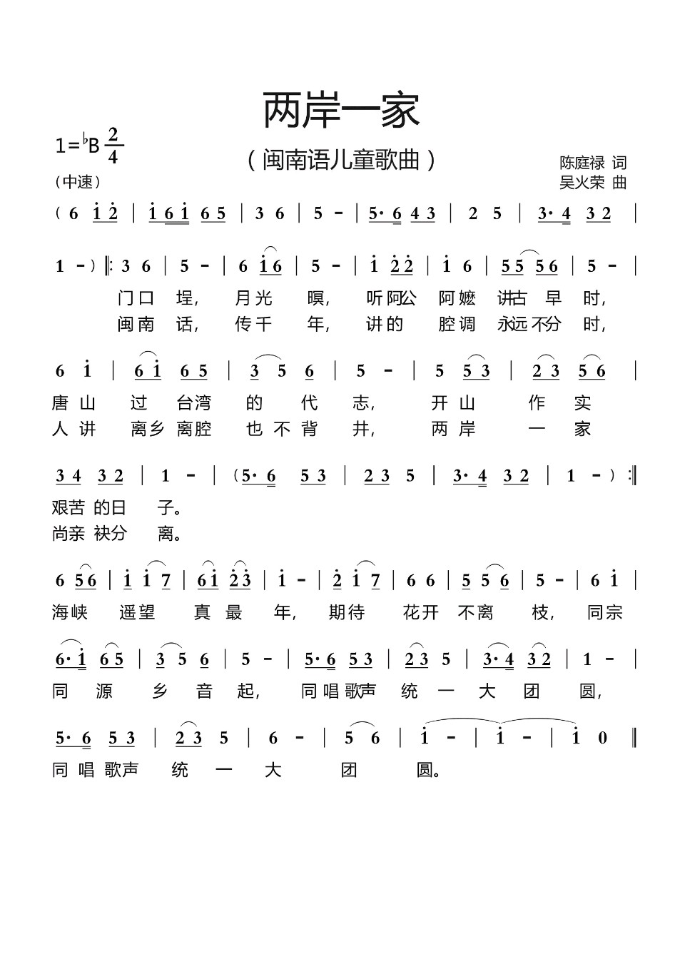 《两岸同一家》闽南语儿童歌曲! 作词:陈庭禄 作曲:吴火荣 编曲:方超 指导老师:简美雀 原唱:黄鸿霖、黄泓锜 篆刻题歌名:苏鹏