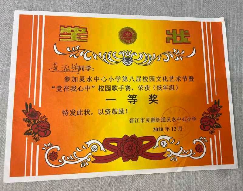 黄泓錡,就读灵水中心小学低年段,自幼跟随台w简美雀老师习歌,一二年级先后获得校园歌唱比赛低年段一二等奖,9月份开学带领全校师生唱响红遍大江南北具有闽南精神的歌曲《爱拼才会赢》。