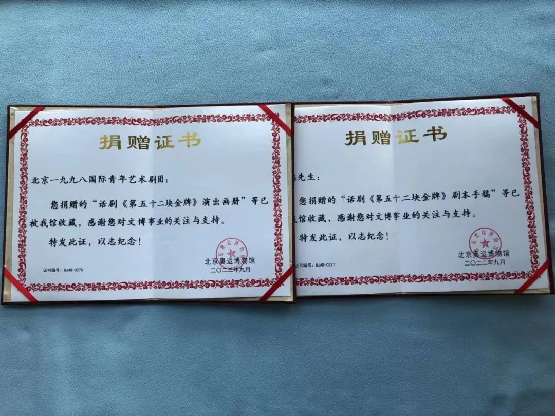 (题记:由国际奥委会和中国奥委会、北京奥组委等部门支持下,于去年发起了“全球征集奥运藏品”活动。王鹏博先生担任编剧导演的中国第一部奥运题材话剧《第五十二块金牌》的演出画册、演出光盘、剧照、剧本手稿等资料荣誉入选为重点藏品。2022年9月21日,北京奥运博物馆向王鹏博先生颁发了捐赠证书。