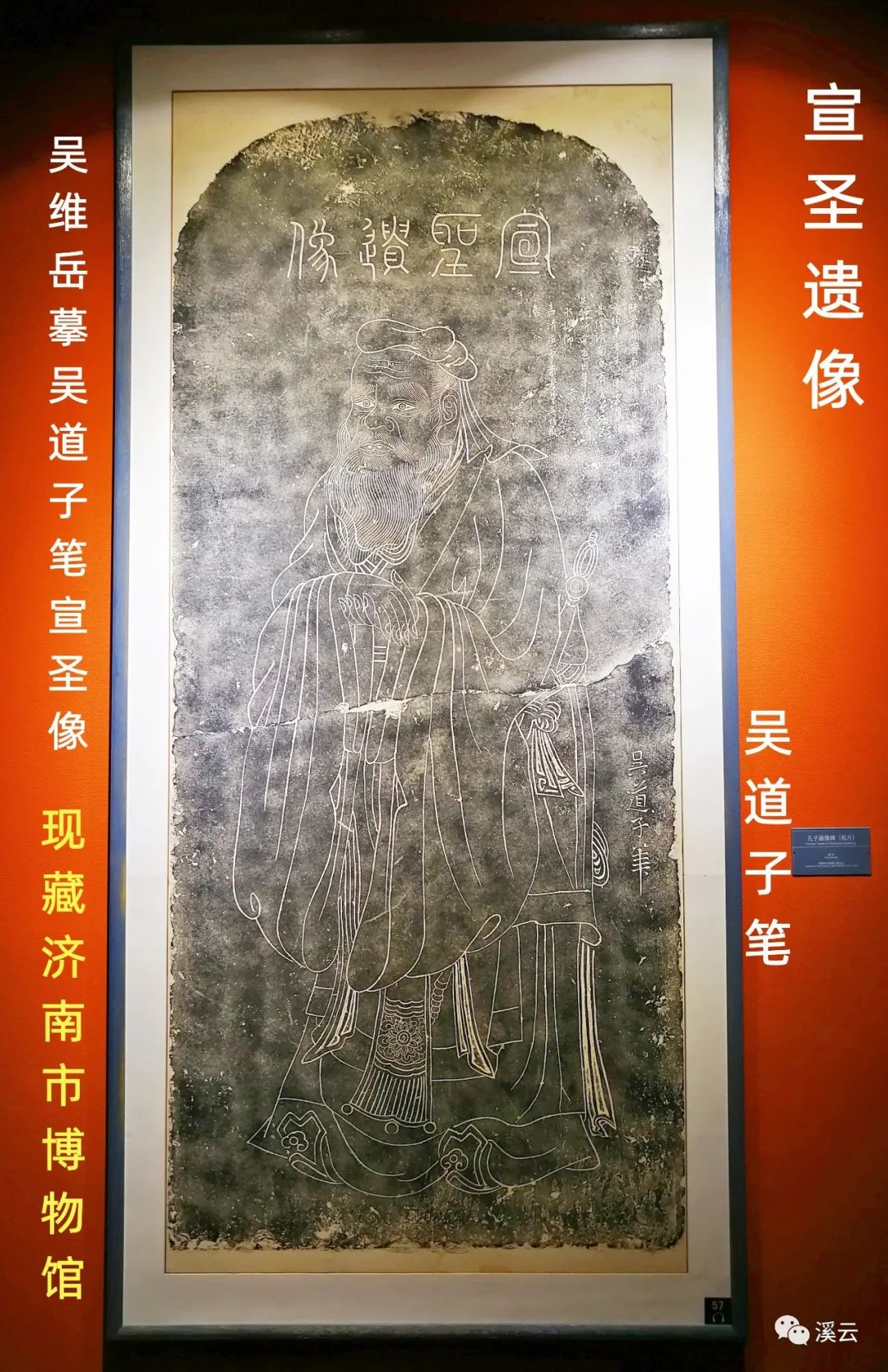 1991年,那时的府学文庙是济南大明湖路小学所在地,学校维修校舍,出土了一块重要的石刻,即"宣圣遗像"碑。此碑原立于大成殿附近。碑额题小篆"宣圣遗像"四字,碑题记为"吴维岳摹吴道子笔宣圣像",正中阴刻孔子行教像,右侧中部下刻隶书"吴道子笔"四字。现存于济南市博物馆。2006年9月23日,中国孔子基金会在孔子故里山东曲阜向全球正式发布了孔子标准像定稿,其形象、服饰、姿势依据的就是唐代吴道子版孔子行教像,年龄60岁至70岁之间,面部表情"温而厉,威而不猛,恭而安"。我们济南人有幸可以到位于济南电视台附近的济南市博物馆去拜赏明代山东学政吴维岳摹吴道子笔宣圣孔子行教像。