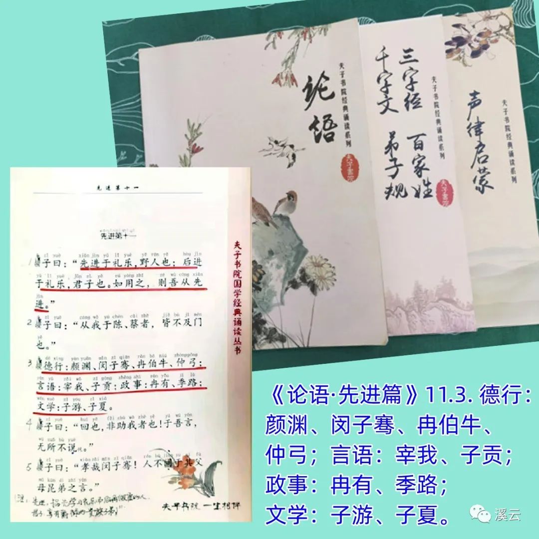 《论语·先进篇》11.3. 记载孔门十哲:“德行:颜渊、闵子骞、冉伯牛、仲弓;言语:宰我、子贡;政事:冉有、季路;文学:子游、子夏。”