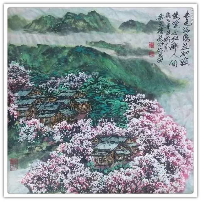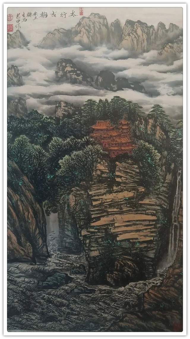 忠田的画有大幅巨构,也有盈尺小品,不论大小,他都能自然得体地匠心独运,呈现出大开大合大山大水的大气势,充分展示出大自然的鬼斧神工。并写诗题赞“法古师今源自然,艺海求索承前贤,铁笔造境留心印,画道酬勤看樂天。”
