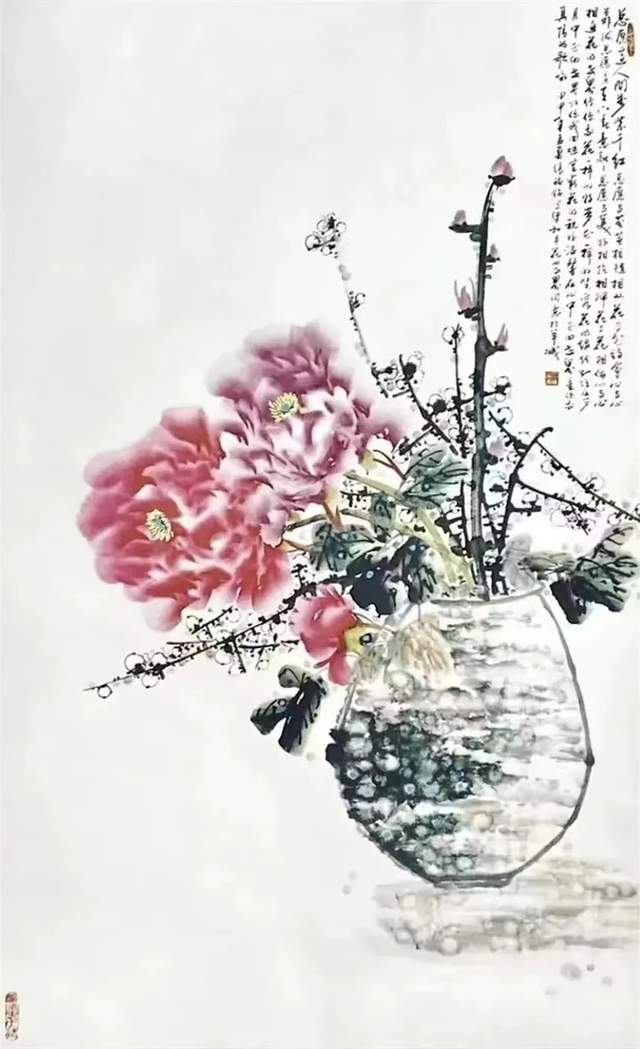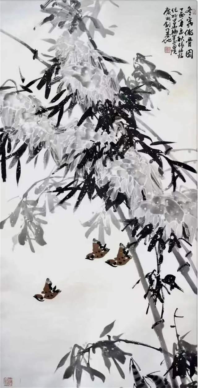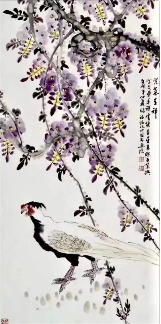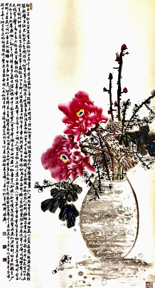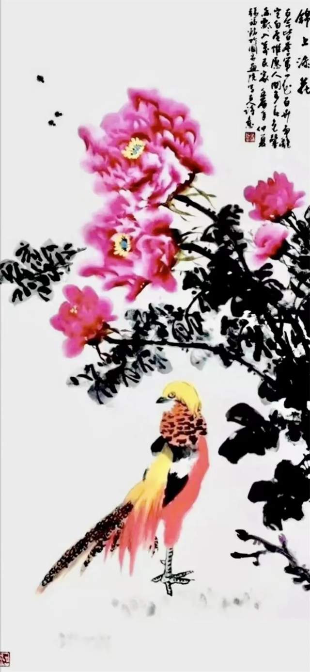 同样,他画其他花鸟作品也是文武兼备的证见!笔墨铿锵写意富贵牡丹,非仅富贵也!最有雄迈品!铁笔塑铁筋,雄墨写雄魂,骨法用笔,应物象形!再经过随类赋彩,就把牡丹画得既有君子之修,也有侠者之勇!他的画法刚则万分刚猛,雄则百倍雄强,给观赏者塑造起一个可以感受震撼力的艺术空间。在这个空间里游目骋怀,必然会心感铮铮!浓墨重彩,浑厚华滋,无限的审美张力,令他成为画坛的铁流派。唯有在军中得到身心熔锻,方得笔墨如此峥嵘!