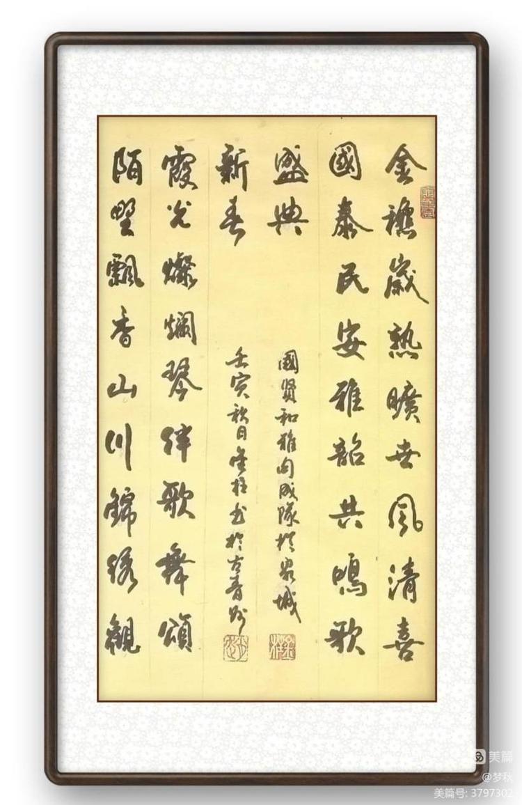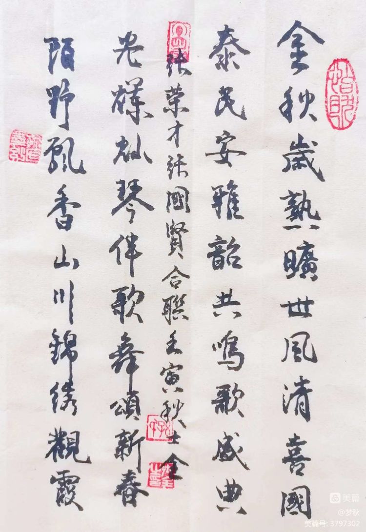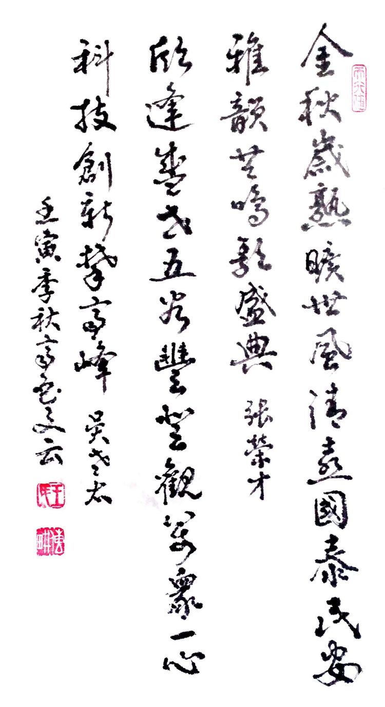 出句:金秋岁熟,旷世风清,喜国泰民安,雅韶共鸣歌盛典;