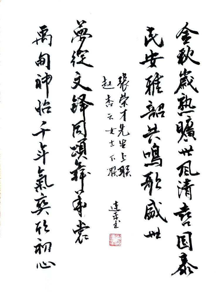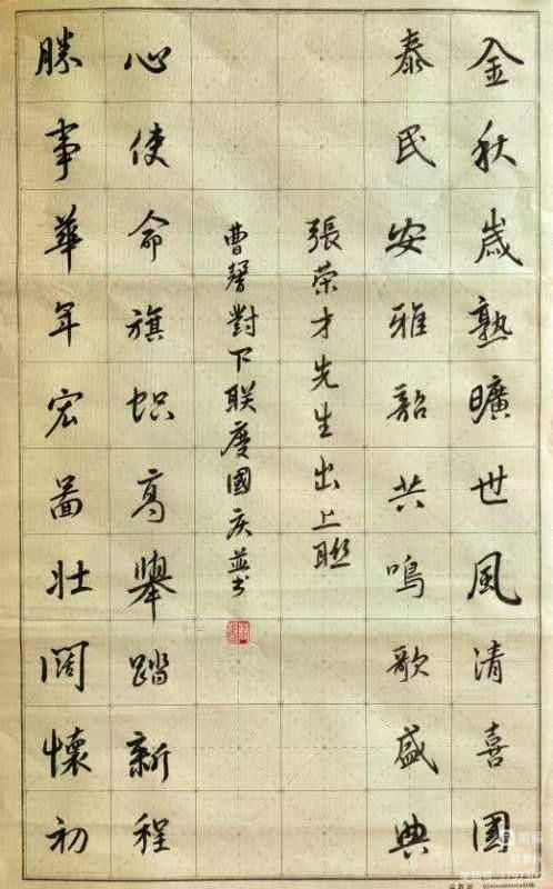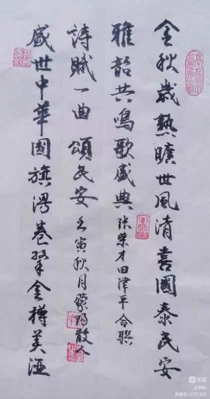 为庆祝国庆节,今明后3天(9月30号,10月1号,2号),本群开展百花楹联活动。张荣才老师出上联,大家可以对下联。书法老师可以跟进,把你感兴趣的对联书写后发群。