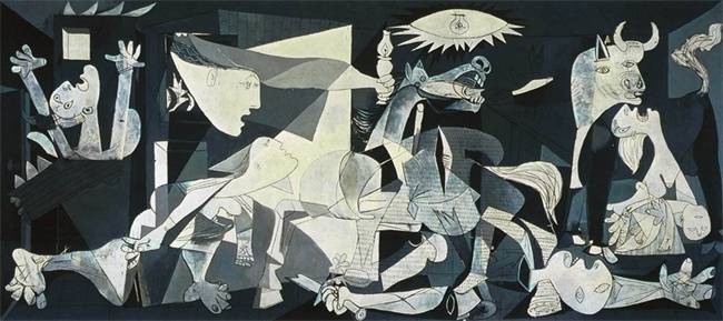 相较于前者,后者是由触目惊心的、狂暴的、尤其是缺乏色彩的形象所构成的画面——其中,色彩是指光影和立体感,也正是由于色彩的缺乏,毕加索仅仅用浅青、浅灰与黑色调的对比就突出了正义与残暴、生命和死亡的极致对立。艺术作品的内容来源于艺术家对生活的认识和理解,在这幅作品当中,毕加索删繁就简、反其道而行之,将明艳的色彩全部摒弃,深刻诠释了战争残暴、痛苦、绝望、恐怖的全部意义。《格尔尼卡》突出了内容的多元,达到了形式与内容的完美统一,在多样统一中,将艺术作品形式与内容不可割裂的必然共生性体现的淋漓尽致。