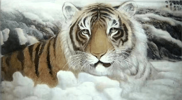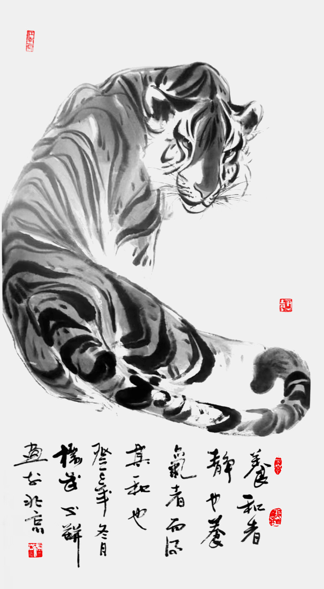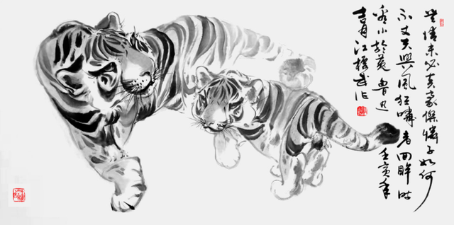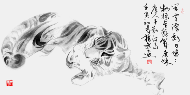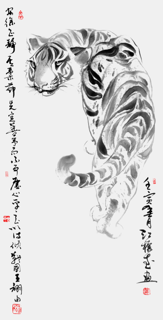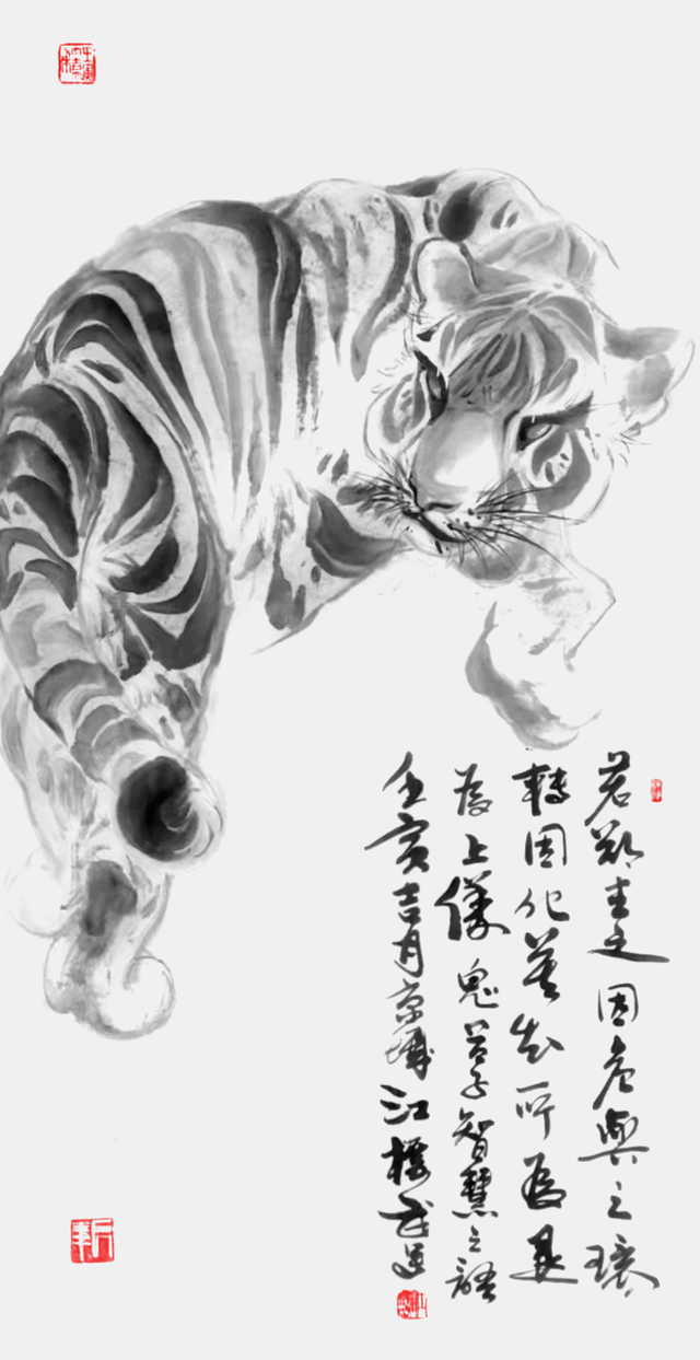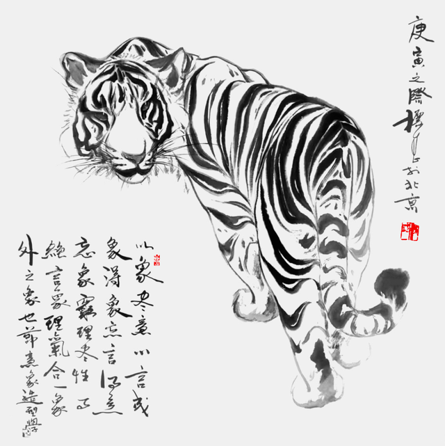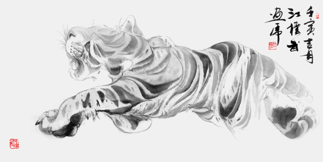 人说闽都画家江标武擅长画虎。既然“擅长”,就该画出特点,画出个性,在造型、笔墨、寓意等方面都应区别于古今画虎名家。看了他的《写意墨虎》图,窃以为传言并非空穴来风。从《写意墨虎》图中可以看出,江先生的造型能力不低。他没有像常人一样从正面构造虎威,因而无需精描锋利的爪子、强健的四腿、尖锐的牙齿和滚圆的眼珠,而是轻描淡写,草草数笔勾出了一只回首凝视的文虎。文而不温,威气内敛,仍不失去野性。笔墨应用也有独到之处。他以兰叶描画虎纹,不仅笔简、形美、神似,且能交待虎躯结构;一描二用,很不简单。更有意思的是,他没有止步于为画虎而画虎,而是通过画虎表达一种如何做人的道理。现在的许多人,尽管不忘把“文明”挂在嘴边,言谈举止却一点也不文明。就以“示能”为例:一些真有能耐的,惟恐别人不知其能,常常锋芒毕露,咄咄逼人;没有真能耐的,也要装能,动辄虚夸声势,狂谈“辉煌”史,一点也不含蓄、谦虚。或许是有感于此风太盛,江先生画文虎一幅,题款曰:“风流不在谈锋胜,袖手无言味更长”。不知那些有能无能、专爱外露之辈看后有何感想?画虎是虎,画猪是猪,决非高明画家。画兽而言人事,格调才不至于低下。