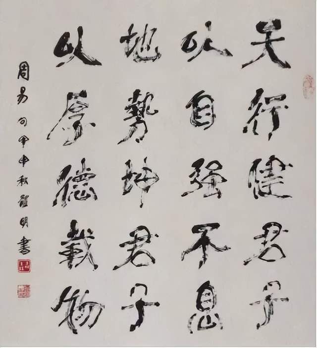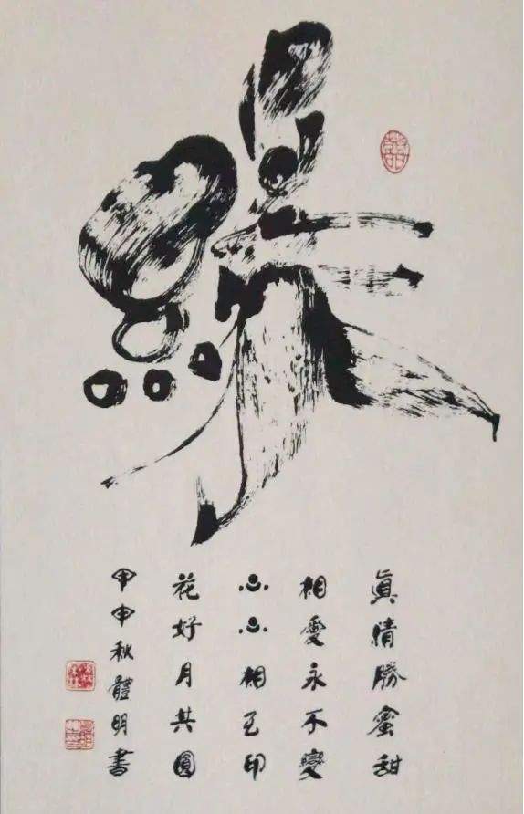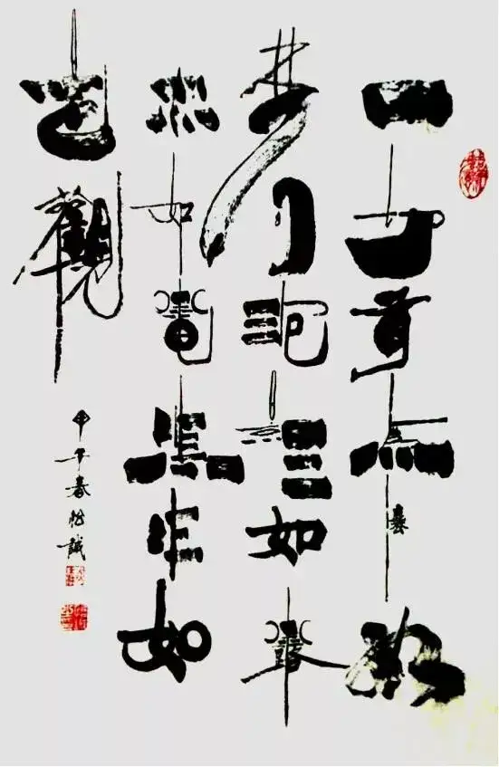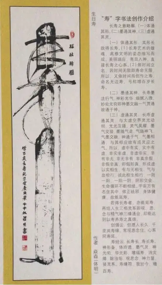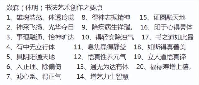 创作理论:本书法艺术是在《柳公权·玄秘塔》的基础上长期创作的同时吸收众家神韵、气息,如:粗与细、大与小、白与黑、有与无、阴与阳、相生相克的运转规律为定律基础,进而超脱进化,由粗俗转为高雅,或是由黑暗走向光明,也是由愚昧化为智慧,由野蛮走向文明的至高点,它的自然过程,既是以墨法气韵达到光华丽神、体透玲珑,大者尽含无为之太虚,虚实相应。非真非假,亦假亦真。一阴一阳,阴阳平衡。具真、具善、具美。具有无为之精神,具天地人之神灵,守真常变而不变,达元常而自立。具上上智之真气与元神合会,入於笔墨,至立神化真品。之所谓前人云之上品“画到极处方似字,字到极处方似画”,大者见雄魄之气概,细者入微妙见精神,其义理具足过去、现在、未来,而又非古非今,妙中非声非色,如斯自智智明,神灵自开自化,自起自落,方能成就无上之真谛。故此作品能开启人生之智慧,澄清心性之昏浊,如是有至诚观思念此作品者,能提神志、得轻安、息焦燥、德静益等之功效。