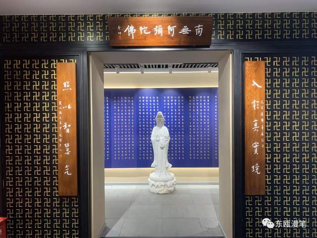 纪念堂设在万佛塔内。拾级仰望,“弘一大师纪念堂”金色大字耀眼夺目。金武先生指着匾额说,“这是弘一大师孙女李莉娟女士书写的。”我这外行一看,俨然“弘体”无异。