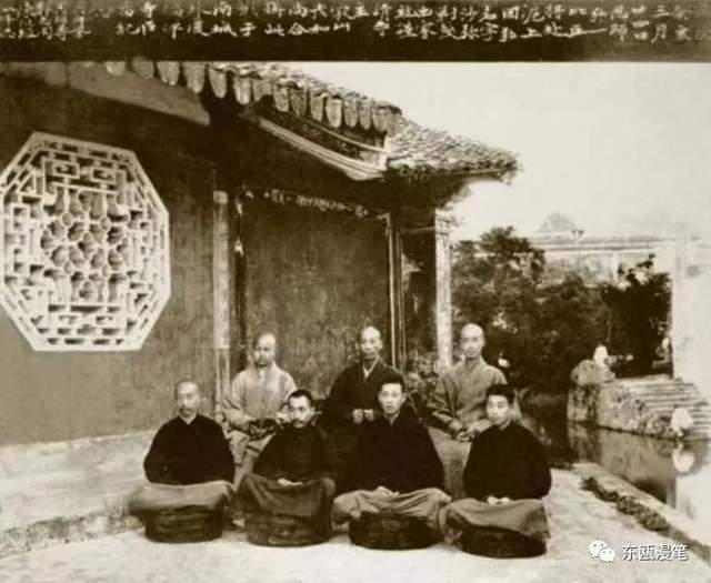 周孟由、周群铮、陈祖经、郭志闳(前排左起),因弘法师、寂山和尚、弘一法师(后排左起)1922年摄于庆福寺