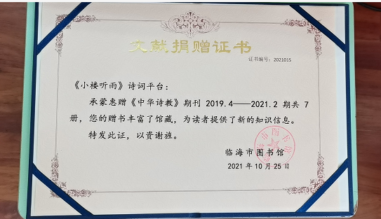 刊有《小楼听雨》诗词有关的所有纸质刊物和书籍捐赠浙江临海市图书馆,作为地方文献永久保存。