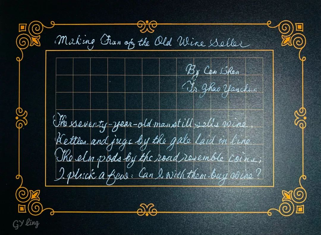 Making Fun of the Old Wine SellerThe seventy-year-old man still sells wine,Kettles and jugs by the gate laid in line.The elm pods by the road resemble coins;I pluck a few: Can I with them buy wine?
