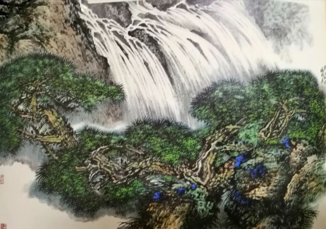尤其是上述提及到的邱先生的《黄山九龙瀑》这幅精美作品,如龙舞动的松干构图,松枝松叶的翠绿色渲染,峰峦间瀑布倾泻而下,构成画面磅礴壮观的气势,令人十分惊艳与震撼!