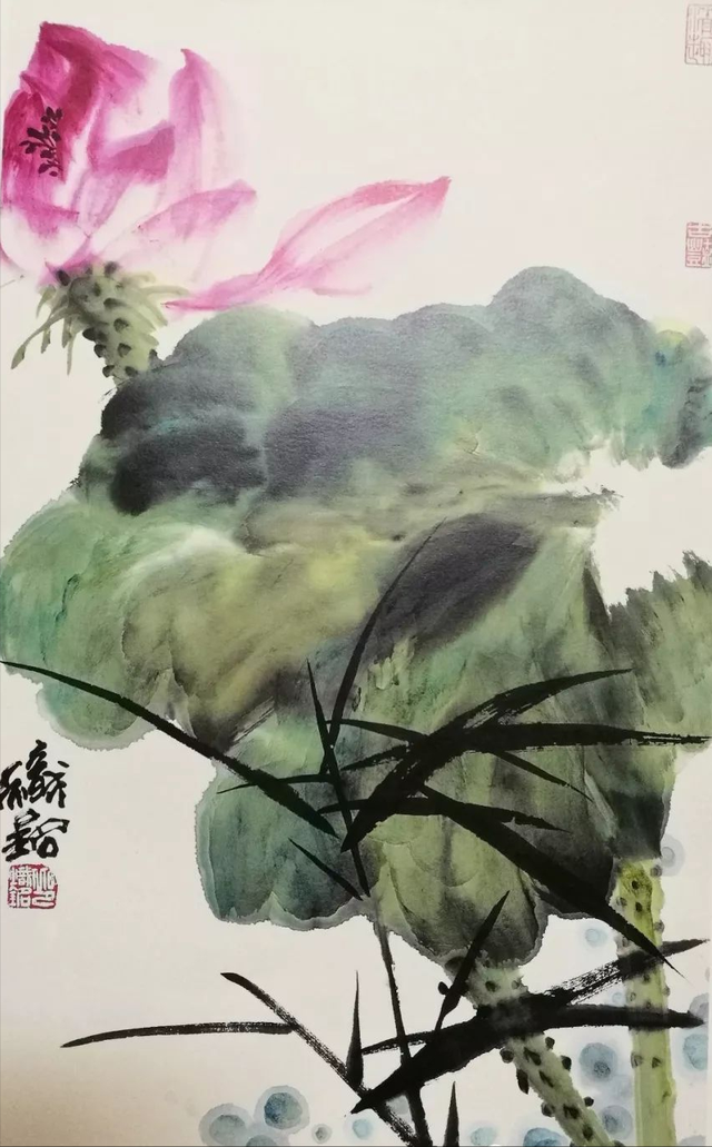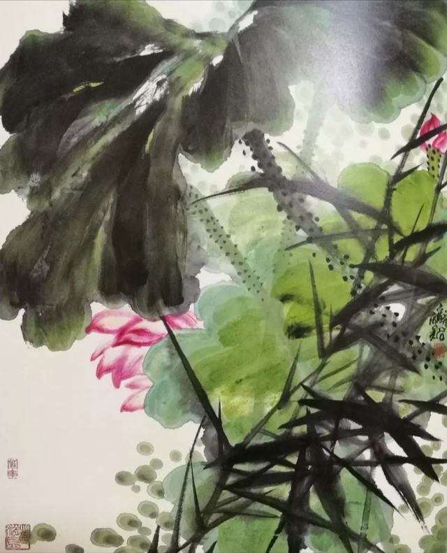 以邱先生的精品荷作《出水芙蓉》为例,细细品味画家在这幅作品中所用渲染技法,就能端详其笔下的荷,大写意概括式特写:朦胧的淡翠色加青黑色做混合渲染,将多片荷叶融为一体,连成一片,仔细观之,单独叶片痕迹依然可以分辨得出,你中有我,我中有你,共荣共生,和谐依存。这样既渲染了荷叶长势茂盛的氛围,又艺术地再现了夏日之荷盎然生机;在那画面的上方,一枝独秀的红荷,以近乎幻影般的姿色,占尽风情,引人入胜,加之其旁一朵未绽放的红蕾,使荷花的自然情调得以显现,丰富了画面的内涵,突出了清水出芙蓉的主题。