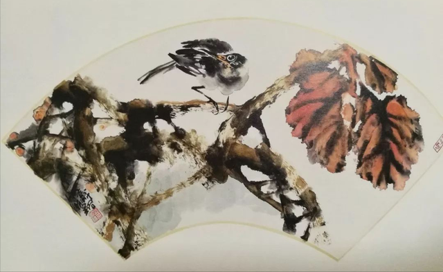 如邱先生的花卉与山石组合《江南春》;苍松与瀑布对呈之景《黄山九龙瀑》;扇面画《枫叶如丹照嫩寒》等,无一不是渲染技法的精妙运用,为画面烘托主景、陪衬背景起到了铺垫、连接与衬托的作用。