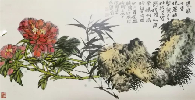第三层次的浸染,画牡丹的叶与背景的陪衬,这对于邱先生来说,由于有了前两个浸染层次的铺垫,有了自我感觉,落墨画叶绘景显得轻松许多,三个浸染层次完毕,画家的脸庞露出了微笑,只见他用淡彩在画面一些部位上,快速地涂抹渲染,至此,一幅精美的《牡丹图》告成!邱先生高兴地持画展示,观看者无不以热烈的掌声给予赞美!