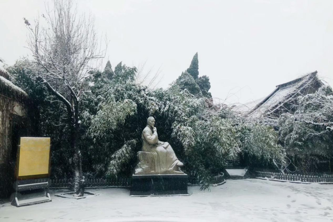 聊斋的后院结合了园林的意境,但依旧是青砖灰瓦的北方民居,雅俗之间刚刚好,在纷纷扬扬的雪中就更好看了。茅草覆盖的屋顶白了,青砖铺就的地面白了,通往“拙园”的小径不见了,满月门也模糊了身影……这是误入了哪位仙家的异境?揣着《聊斋》中熟悉的段落走到这里,入幻怕是会很自然。文学家的笔墨就是有这样的魔力,能让读者在情和境之间产生“纠葛”,抑或愉悦,这种审美只可意会不可言传。