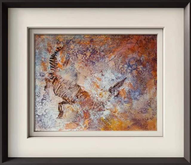 背景与物象不作特别鲜明的层次区分,而是写意成砂砾岩画的紧凑空间,用扁平式的构图方式,让画面呈现出活化石的观感,画出岩画斑驳朴茂的远古印象,具有非常强烈的审美张力,也有独特的文化装饰价值。如若收藏,则会因不可复制而有不可估量的价值潜力!