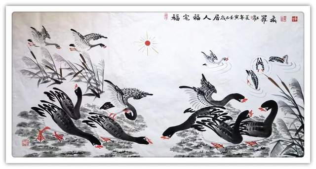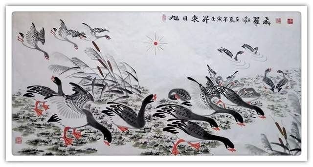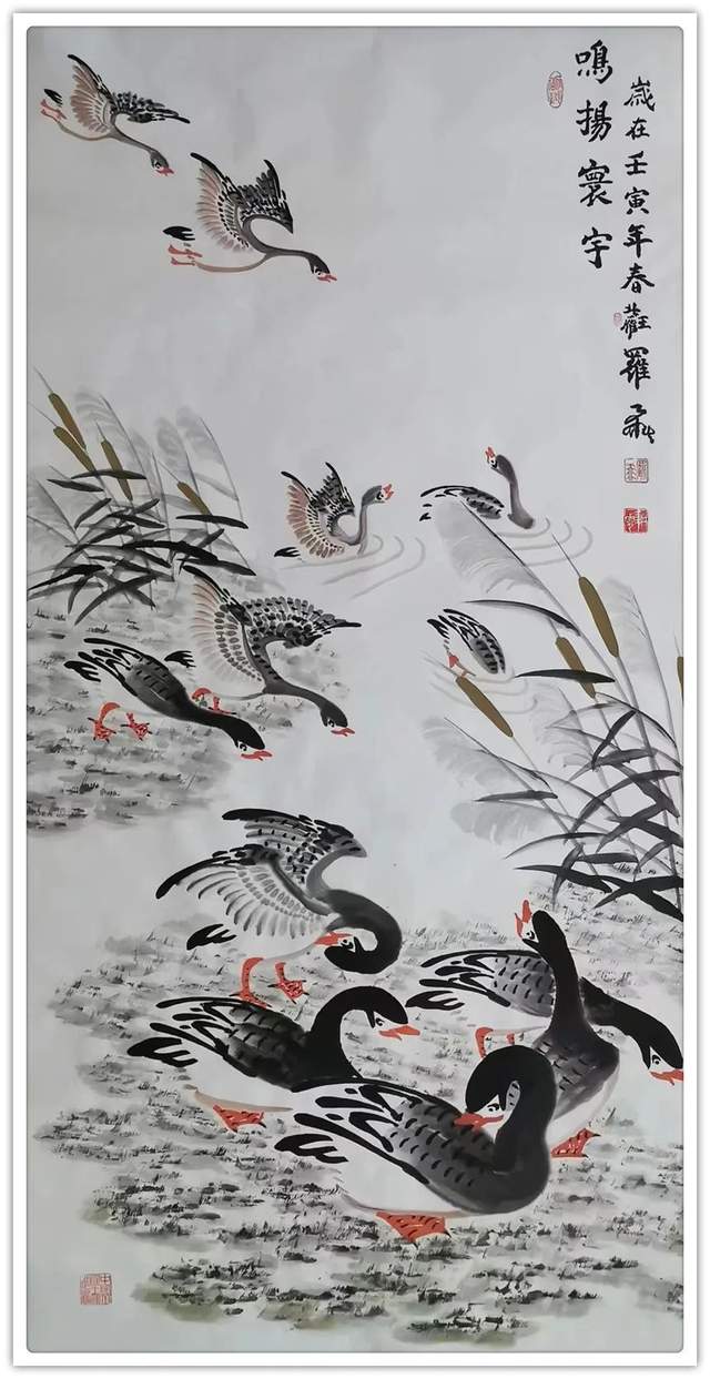 纵观当下画坛,善画鸿雁者虽多,但像罗维存先生这般能将鸿雁精神和鸿雁神韵相继完美付诸于画端之上的画家,却是一种十分少见的存在!不仅如此,不同于大部分只会复刻自然和描摹自然的匠俗画家,罗维存先生的众幅鸿雁作品则是有达到了一种聊写胸中意气的明志境界,旨在以文人功底来传续寓意精神,而经由此所创作出的写意鸿雁丹青,自然也就是有呈现出了极高的审美高度和抒情韵味!而如此画面造诣,也实是当下画坛之罕见也!