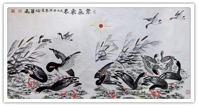 鸿雁形神,是依笔墨之法而生!而今罗维存先生执笔绘鸿雁,固然也是离不开笔墨的写意法门!首观其画所绘鸿雁,是全然没有任何的矫饰修剪之态,媚俗意味更是不见分毫,取而代之的,则是一种钟情自然的天成风趣和野逸美感,而缔造这种风趣和美感的基础,便就是罗维存先生那妙构绝伦的写意笔墨!用笔精准恰宜,用墨纵而豪放,赋色之际更是能穷尽朴卓之风尚,芦苇之间风气荡漾,鸿雁些许匍匐其中,时而群雁栖饮,时而展翅归飞,但无论这些鸿雁形象如何,其生动的传神形态都是能给观赏者带来一种非凡的视觉体验!画面丰富而蕴藉于清逸,芦苇丛深而息羽于鸿雁,此般风雅画意,观之真可谓是雅俗共赏!静谧心境,一目了然!