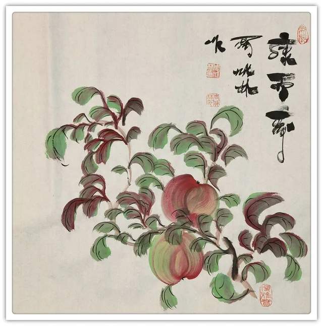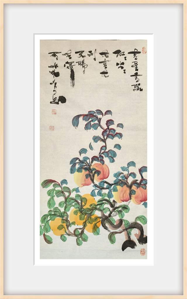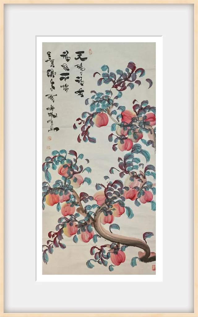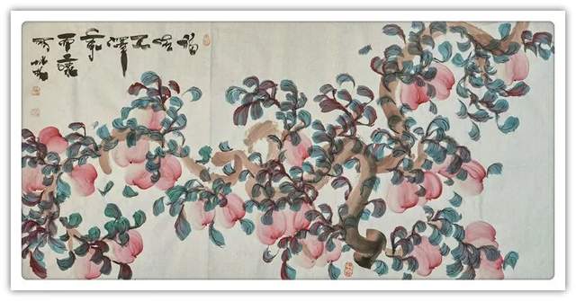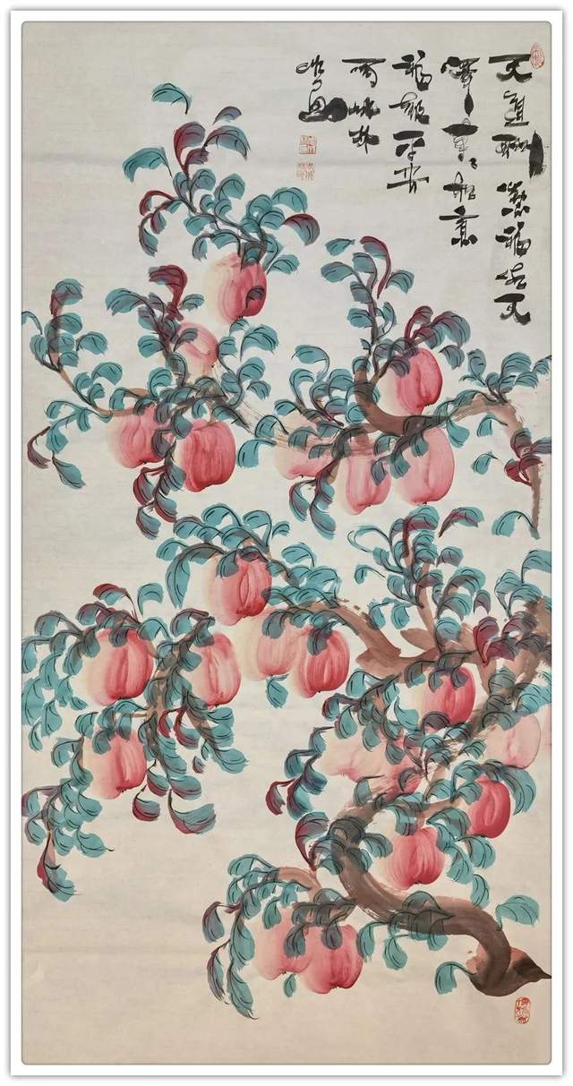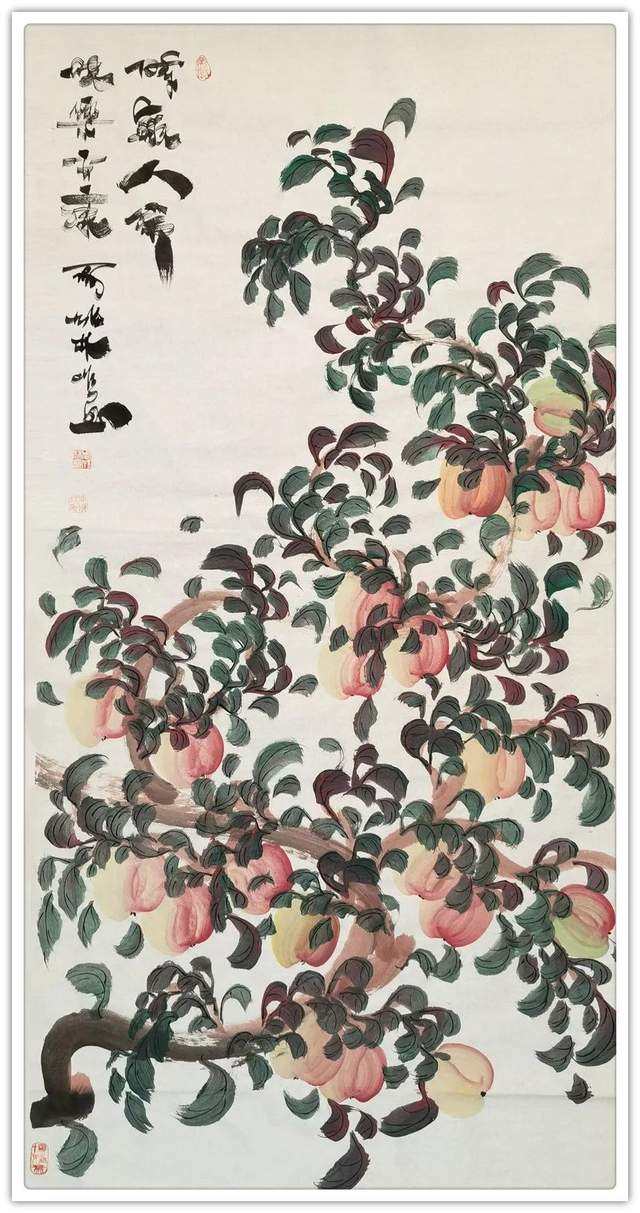 画桃者,是需要有雅俗共赏的文化共识,而今周成林先生执笔作意桃,自然也是有深谙于此共赏情趣!每每作画,是取仙桃之生机,用笔构意精妙绝伦,赋色之际更是独具鲜亮质感,是谓艳而不俗,明而不媚!桃枝树叶,搭配相宜,仙桃三两垂挂其中,时而呈以勃发之势,时而立于硕倚之态,于情于景,可谓都是天趣盎然,雅逸无限!不仅如此,和大部分善画寿意仙桃的画家不同,周成林先生的仙桃丹青则是更加趋向于一种对文人情怀的流露,而这种源自内在的诗情画意和寄寓感受,也自然就是其众幅仙桃作品能够沁人心神的一个重要原因所在!而在石榴题材的画面表现上,周成林先生亦是有致传神于生动,石榴果实丰盈而饱满,色泽更是独见鲜明之亮,枝叶遮果,疏密有致,前后关系恰是可映于自然成趣!如此硕果累累之象,观之也真可谓是寓意生机之佳品也!榴枝低垂,令人垂涎!