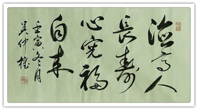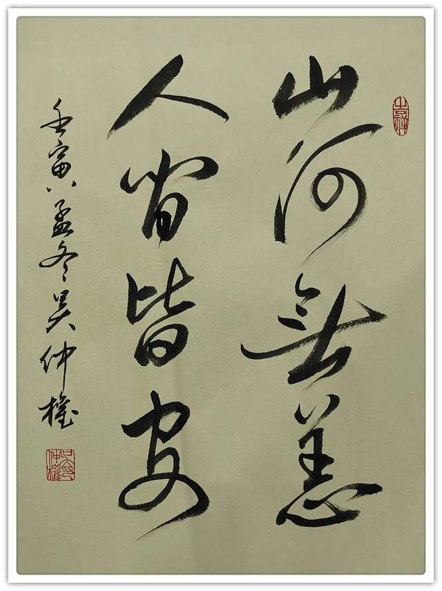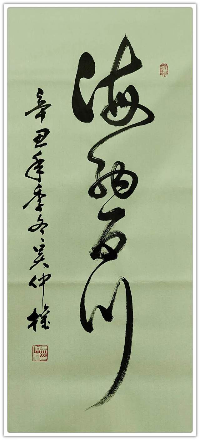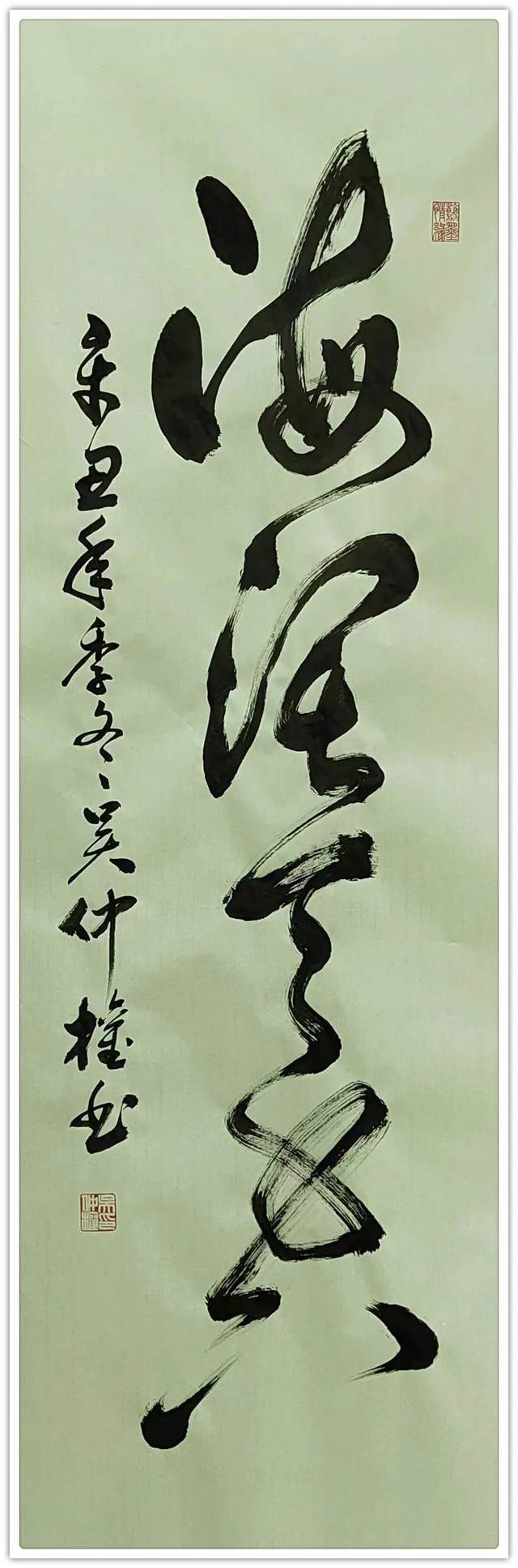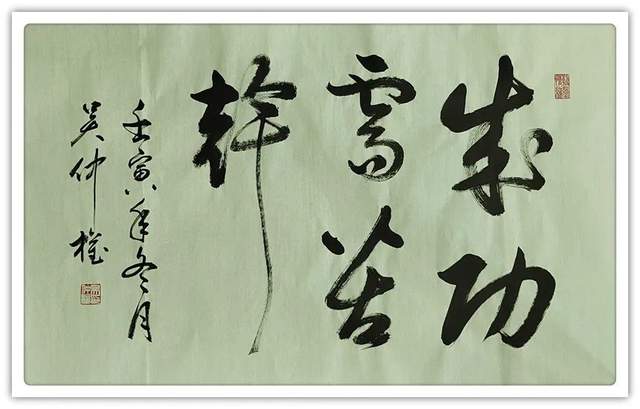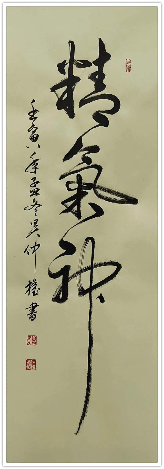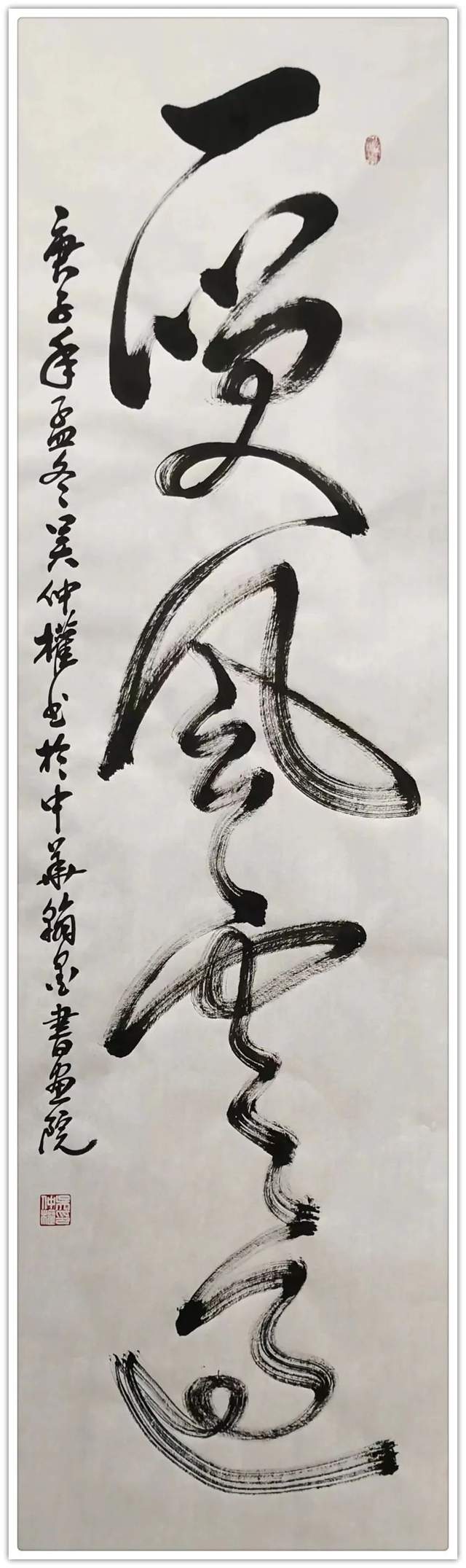 古人于书论曾言,书以筋、骨、血、肉、气而成,此缺一即不可以为书。今以此为基,再去纵观吴仲权先生的众幅书法作品,便就是可以明见其深谙之把握!得益于在取法上的高度把握,其所书草体字势也均是有呈以一种天然之风畅,是谓一任而书,笔墨飞动,能于挥洒自如中见古人根基,亦能于高韵深情中品坚质浩气!线条妙象,俯仰有仪,此般纵览之余,恰是一点之内殊衄挫于毫芒,一画之间变起伏于峰杪,牵丝映带,左右相顾,风樯阵马,痛快淋漓!