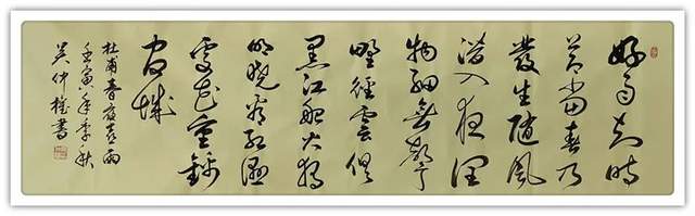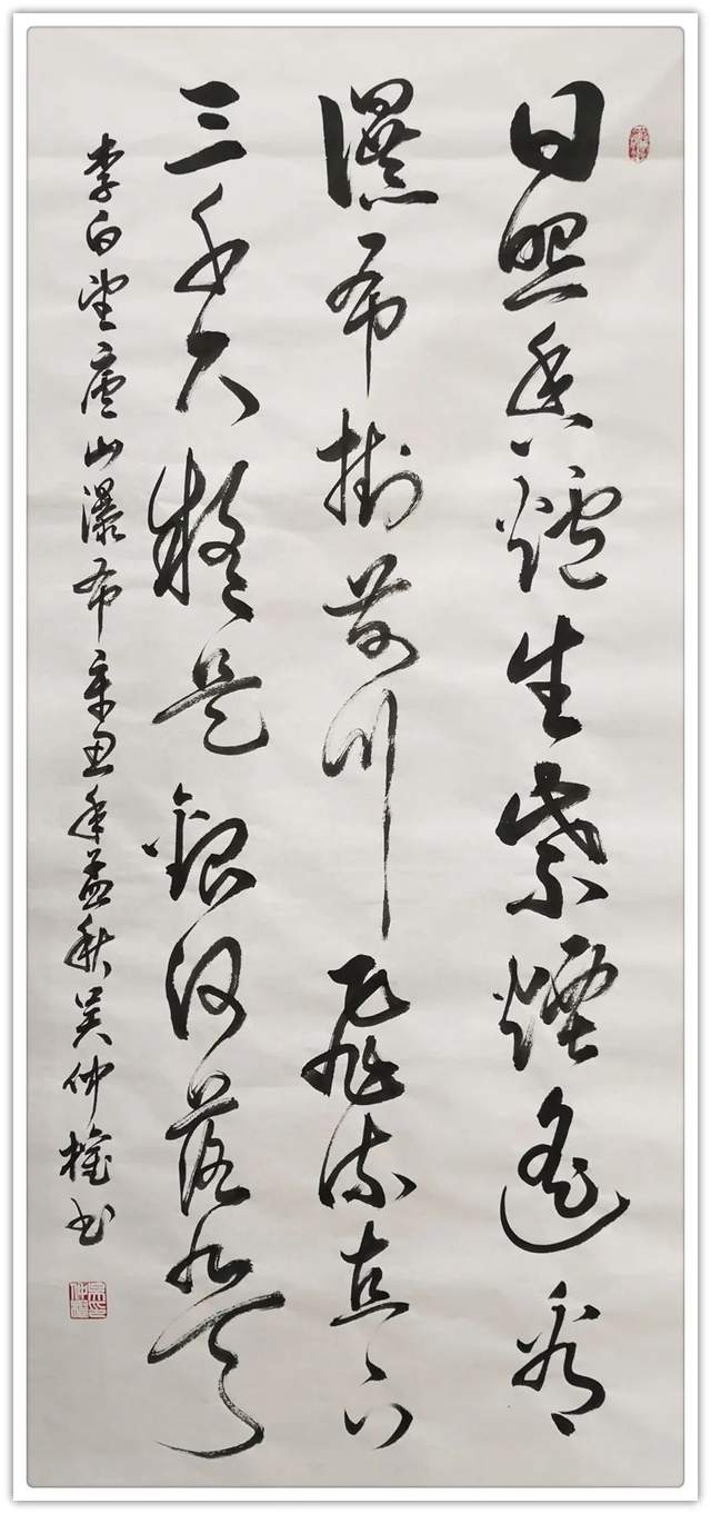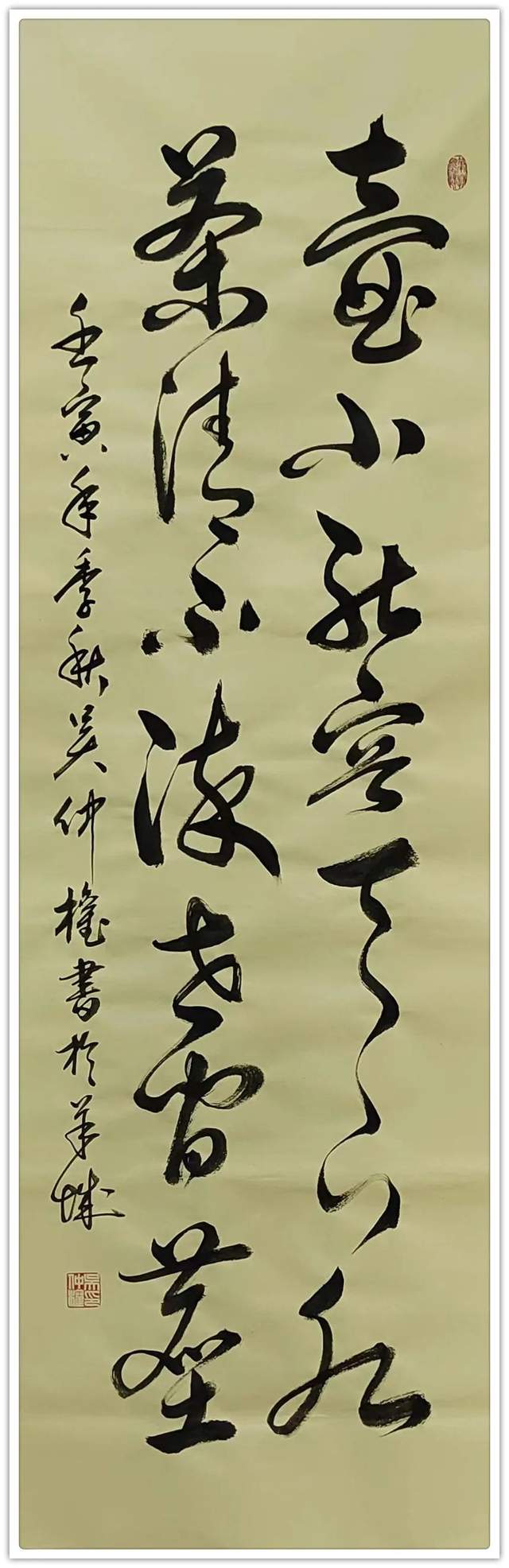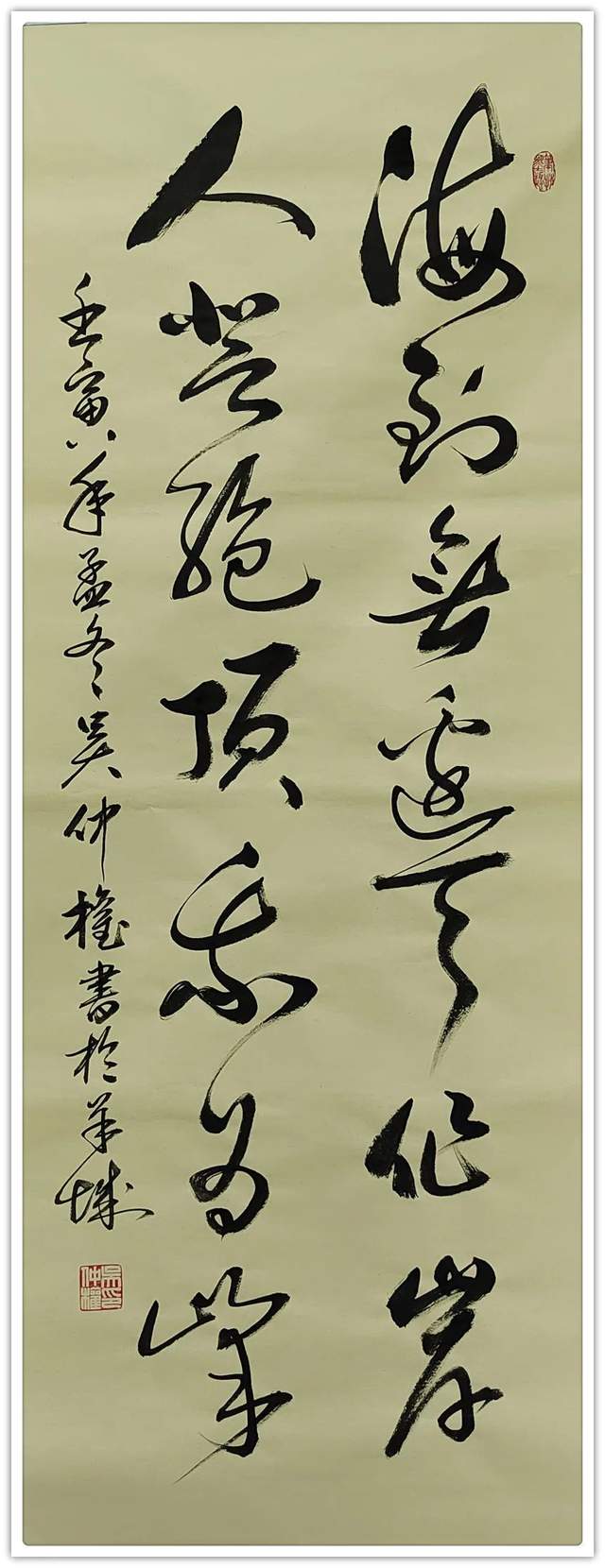 在翰墨取法上,吴仲权先生是有着很明显的古贤脉络余韵,众幅书风尽是可兼以癫张狂素之风范,但和大部分同行书家所不同的是,吴仲权先生的师古之心是丝毫没有拘泥性,取而代之的则是一种食古而化为己用的引导表现,而这也正是其众幅草书作品能够有别于他人的一个重要原因所在!正如书坛共识,是谓楷法无欺,而相比于楷书的这种大众认知,草书的创作过程则就是更是一种可见于书家功力和个性舒展的艺术表现!并且今日的吴仲权先生无论是在草书的用笔上,还是在书风的纵情上,我们也都是能十分清楚的看到他那属于心迹的独特挥毫和宣泄,无拘无束,可见其真!