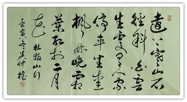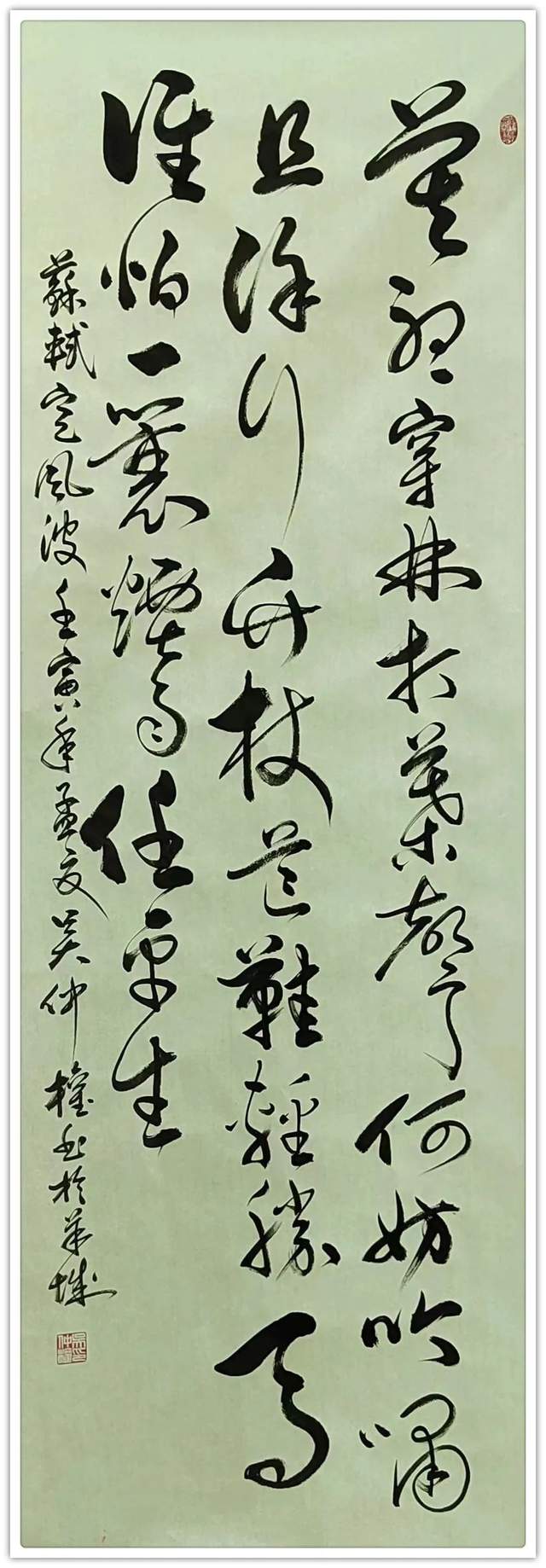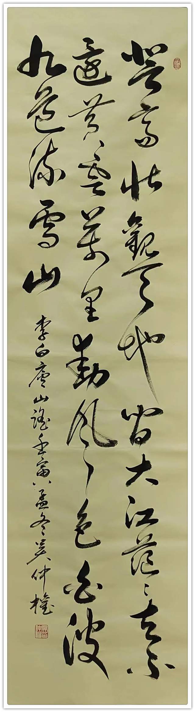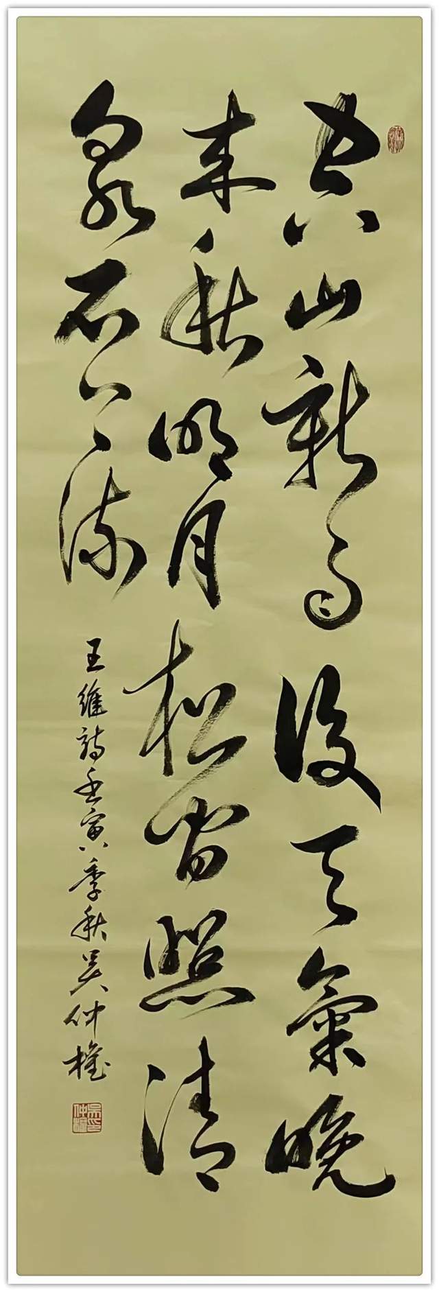 在翰墨取法上,吴仲权先生是有着很明显的古贤脉络余韵,众幅书风尽是可兼以癫张狂素之风范,但和大部分同行书家所不同的是,吴仲权先生的师古之心是丝毫没有拘泥性,取而代之的则是一种食古而化为己用的引导表现,而这也正是其众幅草书作品能够有别于他人的一个重要原因所在!正如书坛共识,是谓楷法无欺,而相比于楷书的这种大众认知,草书的创作过程则就是更是一种可见于书家功力和个性舒展的艺术表现!并且今日的吴仲权先生无论是在草书的用笔上,还是在书风的纵情上,我们也都是能十分清楚的看到他那属于心迹的独特挥毫和宣泄,无拘无束,可见其真!