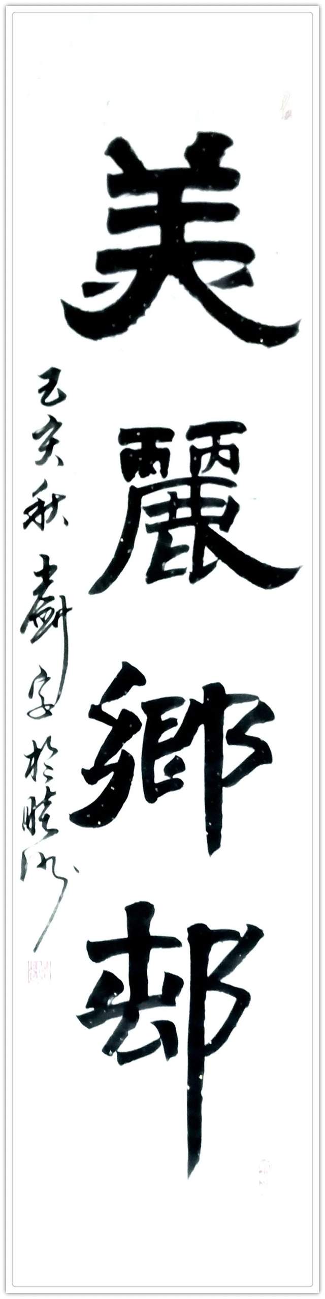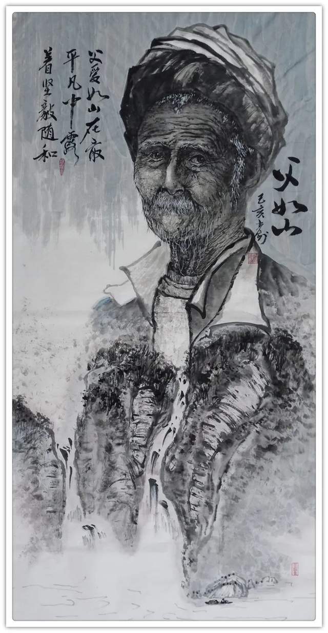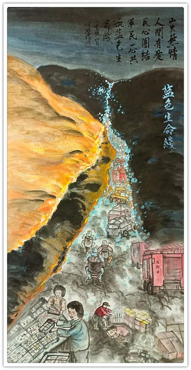 他的书法修养博涉多优,除了楷书精研,还隶书的丰姿多神,也有行草的飘风骤雨惊竦竦,落花飞雪何茫茫。习书谱法二王,琢磨苏黄米蔡,把文人书法的书卷气息表达的一览无余,可以令书法渊妙代不绝人,古今相续。《美丽乡村》一件带着综合各种书法形体要素的玄机要妙,把乡村纯朴而臻美的意象衬托的特别到位,这再一次证明了冯建安先生的书法不但写得好,而且写得特别有文化价值、有实用品质。凡是书法达到这个层面,当然是翰墨攀顶峰的见证。由书法作品,转观他的丹青创作,亦是一派笔墨当随时代的文化力量。刚刚过去的山火事件,就被冯建安敏锐地捕捉到事件里万众一心的精气神,铺笔心叙。画下了《蓝色生命线》这件作品,很能体现冯建安创作主题的高瞻远瞩。这一类作品是他创作的主要方向,比如抗疫系列中的《抗疫英雄强强组合》《父爱如山》《守艺人》等等,形神兼备,是谓当代美术可以倾诉国家精神和人文精神的代表作品。