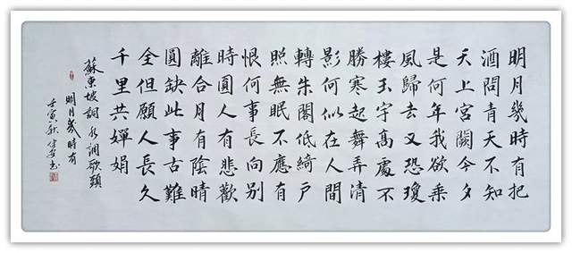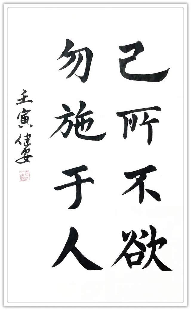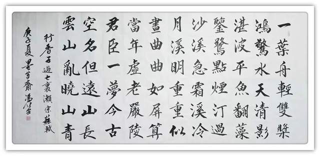 关于书法,他有可作金书锦字的真功夫。比如他写的《陶朱公致富营业良规》这篇书法作品,既是优雅的书法作品,也是可以弘扬社会正能量的弘大篇章。小楷丰姿多神,笔墨严谨无弊,把楷书与做事做人的主题思想融为一体,正是中国人端端正正作人,堂堂正正做事的经典表达。楷书深刻地影响着中国的文化进程,现在冯建安先生在这一进程中,用扎实的书法基本功,擎起了“端正”的大旗帜,让楷书再一次以富有社会文化号召力的姿态,释放着追求公正良心的正能量!好的书法,莫不如此。书法遵道而贵德,最可以令人万分折服。冯建安的楷书取法欧楷的险笔复归平正,参意颜筋柳骨,完成了楷精法详的修养,拥有了楷法无欺的力量!