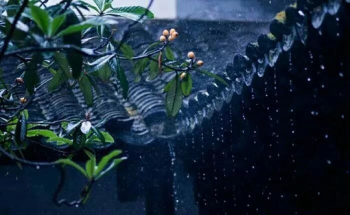 The lad hears rain fall upstairs,The man hears rain lash th' canoe,Stream broad, clouds low.In the sough the stray birds coo.The rain soaks his hut today,Joys, worries and parting woe,