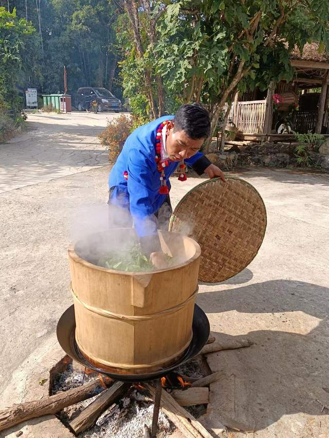 赵腊退家的院子里,架着一口蒸着茶叶的大锅,锅下火苗正旺。和其他茶叶制作工序的炒茶“杀青”工序不同;酸茶制作采用了蒸馏除菌的流程,在杀菌的同时,最大程度地保持茶叶的湿润。在古老的德昂族酸茶制作工序中,有10多道之多,最重要的程序有蒸、揉、捂、舂、成这几道工序。