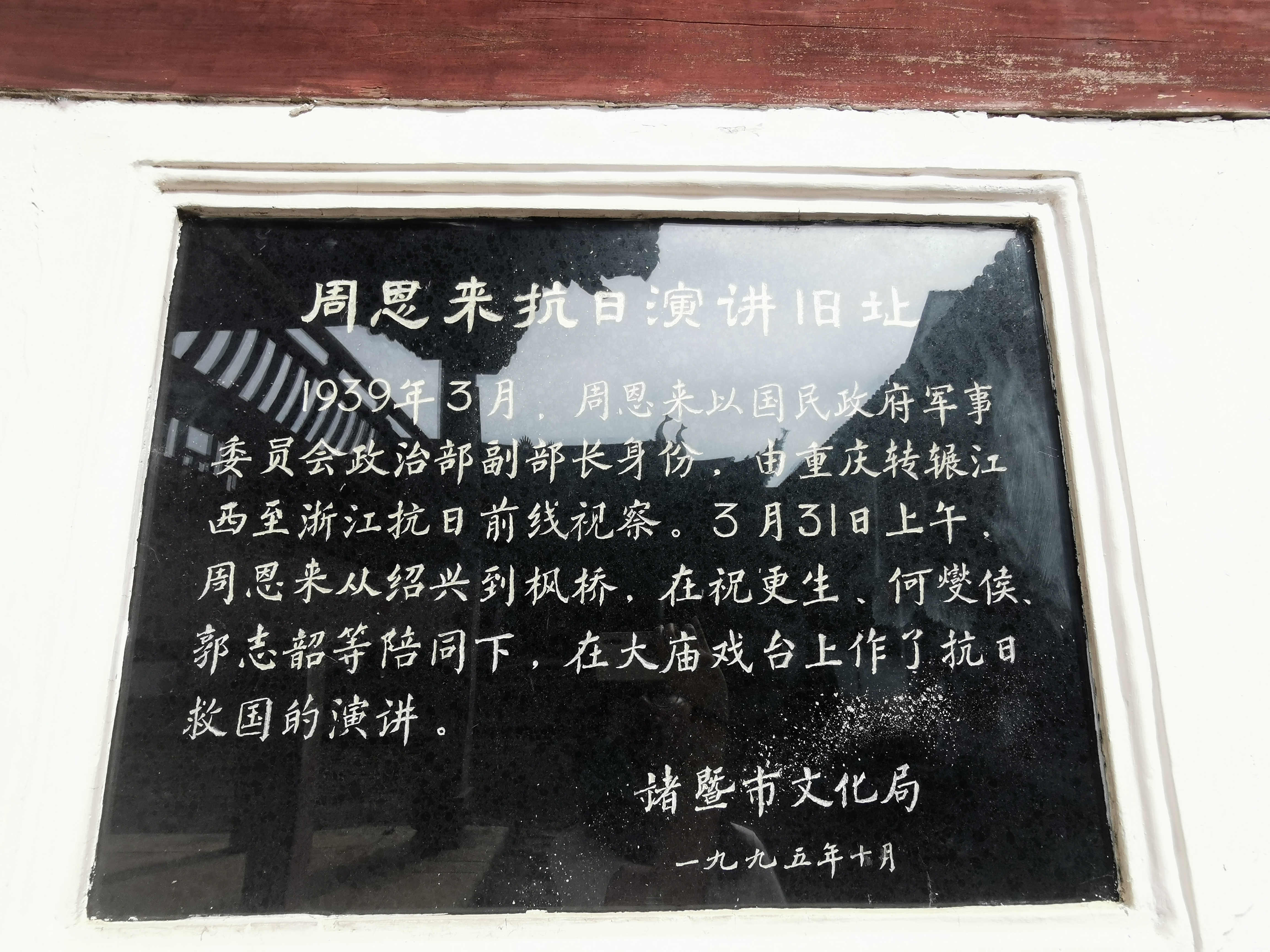 3月31日,周恩来离开绍兴前往金华,途经诸暨枫桥时,他来到枫桥大庙,现场“欢迎周副部长亲临前线指导抗日”的口号声此起彼伏。在祝更生、何燮侯、郭志韶等同志的陪同下,周恩来在大庙戏台上,向聚集在枫桥大庙的工人救亡协会、农民救亡协会和妇女训练班的成员及广大群众发表演讲,宣传中国共产党《抗日救国十大纲领》和毛泽东关于持久战的战略思想,号召大家在抗日民族统一战线的旗帜下团结起来,有钱出钱,有力出力,同心协力,一致抗日,为取得抗战的最后胜利而奋斗。
