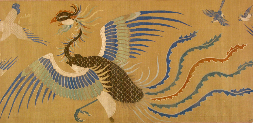 图像内容源于中国古代传说,传说中凤鸟本为一只普通的小鸟,用自己采摘积攒的果实拯救了濒临饿死的其他鸟类。这些鸟类为报恩各自献出一根最美丽的羽毛给凤鸟,于是凤鸟成为了所有鸟中最漂亮的鸟。故事体现了群体间的感恩与互助,和谐共生,合作共赢的生存准则,至今仍广泛流传百鸟朝凤的故事,百姓家有喜事时常悬挂此题材刺绣品。